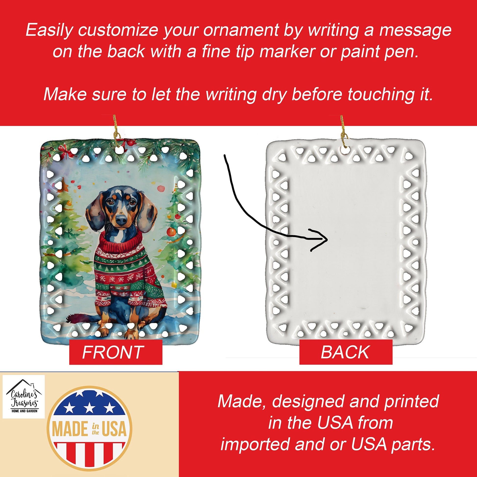 Porcelain Ornament featuring breed specific Dachshund artwork. Celebrate Christmas with this Christmas Ornament. Add a unique, personal touch to your holiday decor with our Rectangular Lattice Porcelain Ornament. Perfect for creating cherished memories, this high-quality ornament shines under festive lights, reflecting warmth and joy throughout your Christmas tree. Crafted with a glossy finish, it showcases vibrant, full-color artwork contributed by our talented artists, ensuring your tree is adorned with a burst of color and holiday spirit. What sets this Porcelain Ornament apart is its customizable white back. Use a paint pen or permanent marker to write a heartfelt message, commemorate a special year, or mark an unforgettable date, turning this ornament into a keepsake that will be treasured for years to come. For best results, allow any personalization to dry thoroughly before handling. Each ornament comes complete with a delicate gold cord, making it easy to hang and display. Proudly made in the USA, this ornament measures 3.375 x 2.625 inches and is a thoughtful gift for pet sitters, teachers, family members, or anyone who would appreciate a little extra holiday magic. Bring style, charm, and a touch of personal meaning to your Christmas tree with this beautifully designed ornament..