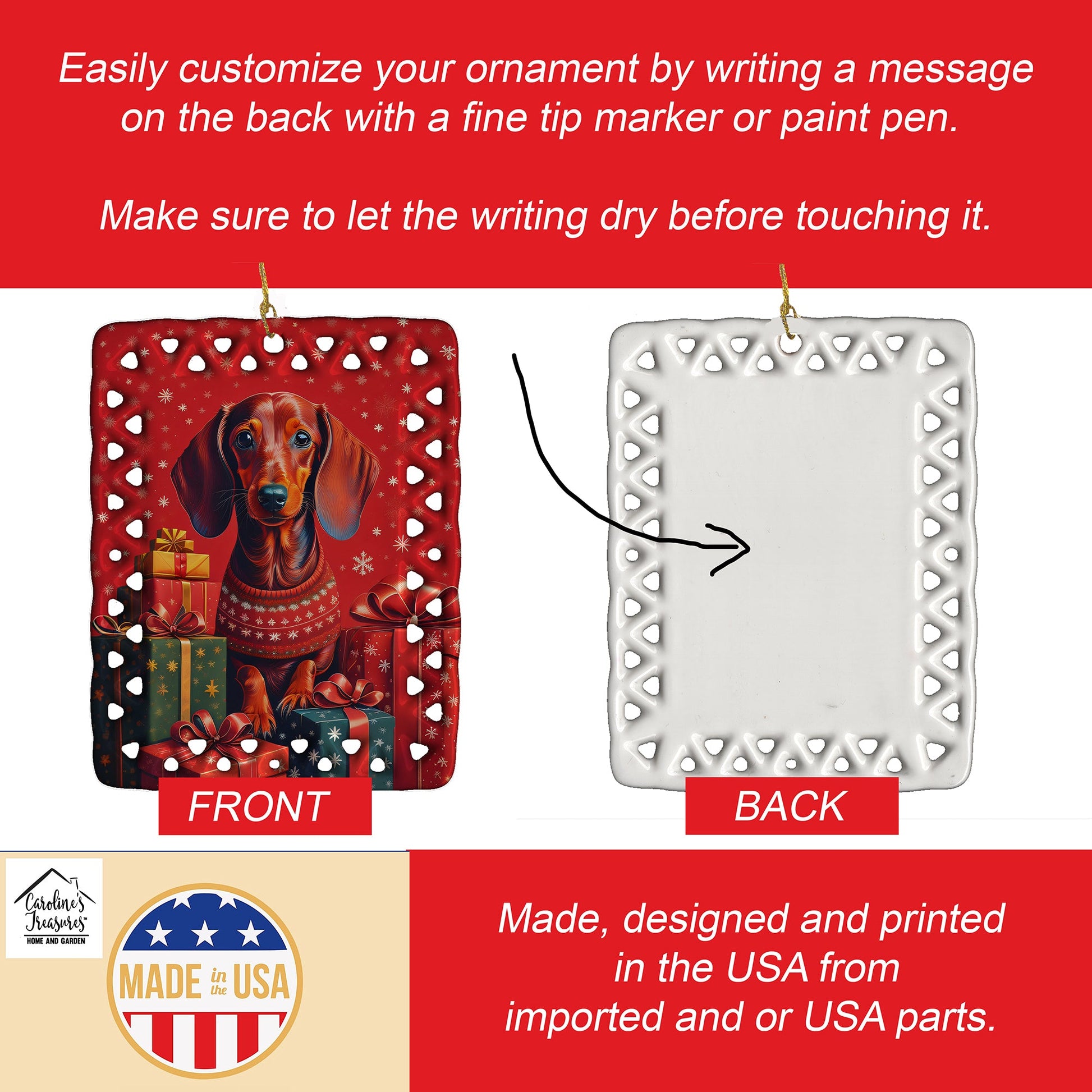 Porcelain Ornament featuring breed specific Dachshund artwork. Celebrate Christmas with this Christmas Ornament. Add a unique, personal touch to your holiday decor with our Rectangular Lattice Porcelain Ornament. Perfect for creating cherished memories, this high-quality ornament shines under festive lights, reflecting warmth and joy throughout your Christmas tree. Crafted with a glossy finish, it showcases vibrant, full-color artwork contributed by our talented artists, ensuring your tree is adorned with a burst of color and holiday spirit. What sets this Porcelain Ornament apart is its customizable white back. Use a paint pen or permanent marker to write a heartfelt message, commemorate a special year, or mark an unforgettable date, turning this ornament into a keepsake that will be treasured for years to come. For best results, allow any personalization to dry thoroughly before handling. Each ornament comes complete with a delicate gold cord, making it easy to hang and display. Proudly made in the USA, this ornament measures 3.375 x 2.625 inches and is a thoughtful gift for pet sitters, teachers, family members, or anyone who would appreciate a little extra holiday magic. Bring style, charm, and a touch of personal meaning to your Christmas tree with this beautifully designed ornament..