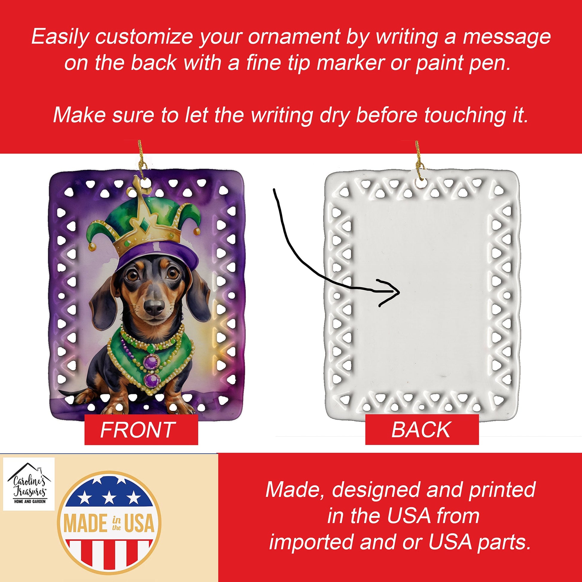 Porcelain Ornament featuring breed specific Dachshund artwork. Celebrate Mardi Gras with this Mardi Gras Ornament. Add a unique, personal touch to your holiday decor with our Rectangular Lattice Porcelain Ornament. Perfect for creating cherished memories, this high-quality ornament shines under festive lights, reflecting warmth and joy throughout your Christmas tree. Crafted with a glossy finish, it showcases vibrant, full-color artwork contributed by our talented artists, ensuring your tree is adorned with a burst of color and holiday spirit. What sets this Porcelain Ornament apart is its customizable white back. Use a paint pen or permanent marker to write a heartfelt message, commemorate a special year, or mark an unforgettable date, turning this ornament into a keepsake that will be treasured for years to come. For best results, allow any personalization to dry thoroughly before handling. Each ornament comes complete with a delicate gold cord, making it easy to hang and display. Proudly made in the USA, this ornament measures 3.375 x 2.625 inches and is a thoughtful gift for pet sitters, teachers, family members, or anyone who would appreciate a little extra holiday magic. Bring style, charm, and a touch of personal meaning to your Christmas tree with this beautifully designed ornament..