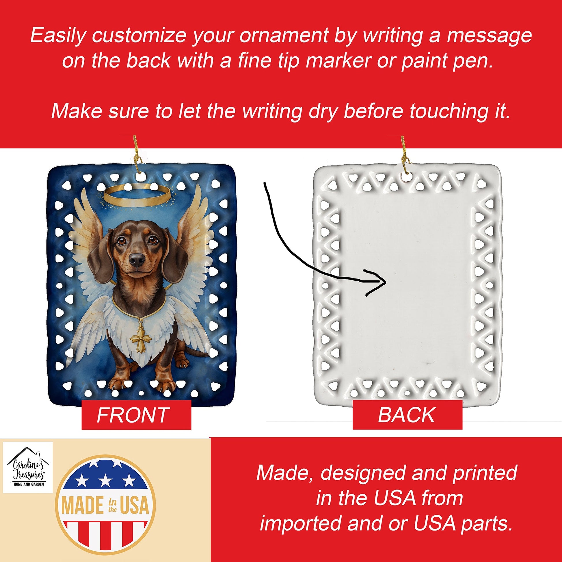 Porcelain Ornament featuring breed specific Dachshund artwork. Celebrate Christmas with this Christmas Ornament. Add a unique, personal touch to your holiday decor with our Rectangular Lattice Porcelain Ornament. Perfect for creating cherished memories, this high-quality ornament shines under festive lights, reflecting warmth and joy throughout your Christmas tree. Crafted with a glossy finish, it showcases vibrant, full-color artwork contributed by our talented artists, ensuring your tree is adorned with a burst of color and holiday spirit. What sets this Porcelain Ornament apart is its customizable white back. Use a paint pen or permanent marker to write a heartfelt message, commemorate a special year, or mark an unforgettable date, turning this ornament into a keepsake that will be treasured for years to come. For best results, allow any personalization to dry thoroughly before handling. Each ornament comes complete with a delicate gold cord, making it easy to hang and display. Proudly made in the USA, this ornament measures 3.375 x 2.625 inches and is a thoughtful gift for pet sitters, teachers, family members, or anyone who would appreciate a little extra holiday magic. Bring style, charm, and a touch of personal meaning to your Christmas tree with this beautifully designed ornament..