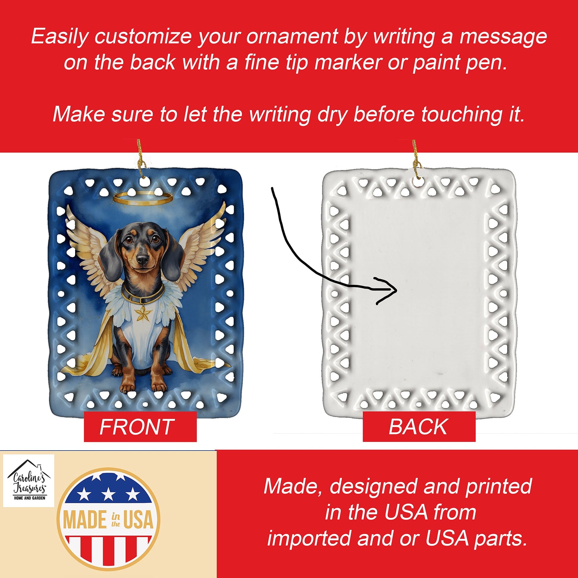 Porcelain Ornament featuring breed specific Dachshund artwork. Celebrate Christmas with this Christmas Ornament. Add a unique, personal touch to your holiday decor with our Rectangular Lattice Porcelain Ornament. Perfect for creating cherished memories, this high-quality ornament shines under festive lights, reflecting warmth and joy throughout your Christmas tree. Crafted with a glossy finish, it showcases vibrant, full-color artwork contributed by our talented artists, ensuring your tree is adorned with a burst of color and holiday spirit. What sets this Porcelain Ornament apart is its customizable white back. Use a paint pen or permanent marker to write a heartfelt message, commemorate a special year, or mark an unforgettable date, turning this ornament into a keepsake that will be treasured for years to come. For best results, allow any personalization to dry thoroughly before handling. Each ornament comes complete with a delicate gold cord, making it easy to hang and display. Proudly made in the USA, this ornament measures 3.375 x 2.625 inches and is a thoughtful gift for pet sitters, teachers, family members, or anyone who would appreciate a little extra holiday magic. Bring style, charm, and a touch of personal meaning to your Christmas tree with this beautifully designed ornament..