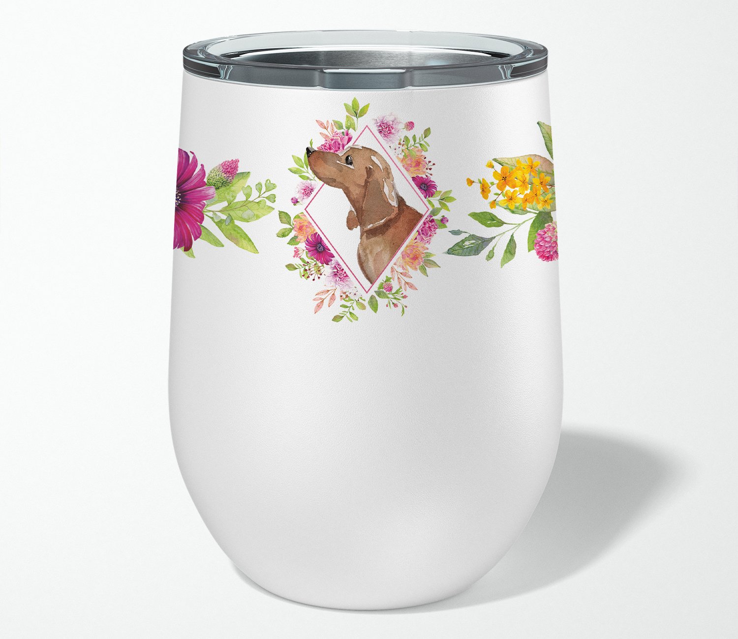 Dachshund Pink Flowers Stainless Steel 12 oz Stemless Wine Glass CK4207TBL12