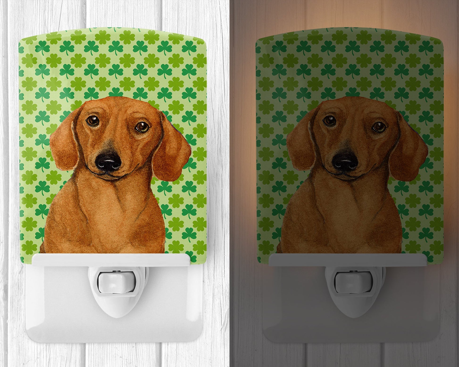 Decorate your space with our St Patrick's Day Dachshund artwork on a Night Light. Introduce a splash of artistic flair and subtle illumination to your space with the Decorative Ceramic Night Light from Caroline's Treasures. Perfect for any room, this night light seamlessly blends functionality with an aesthetic appeal, offering a stylish solution to brighten up dark corners of your home or office. Boasting a six-inch high by four-inch wide ceramic tile at the front, it showcases vivid, full-color artwork from distinguished artists, transforming a simple utility into a vibrant art piece. The artwork is securely encased in a robust metal holder, ensuring durability and longevity. Two screws are provided to firmly affix the tile into the holder. The holder extends three inches deep, housing an included bulb that emits a soft, welcoming glow. This product meets all safety standards, as evidenced by its UL approval. Proudly made in the United States from imported components, this Decorative Ceramic Night Light is not just a functional device; it's a statement piece that enhances the ambiance of your surroundings.