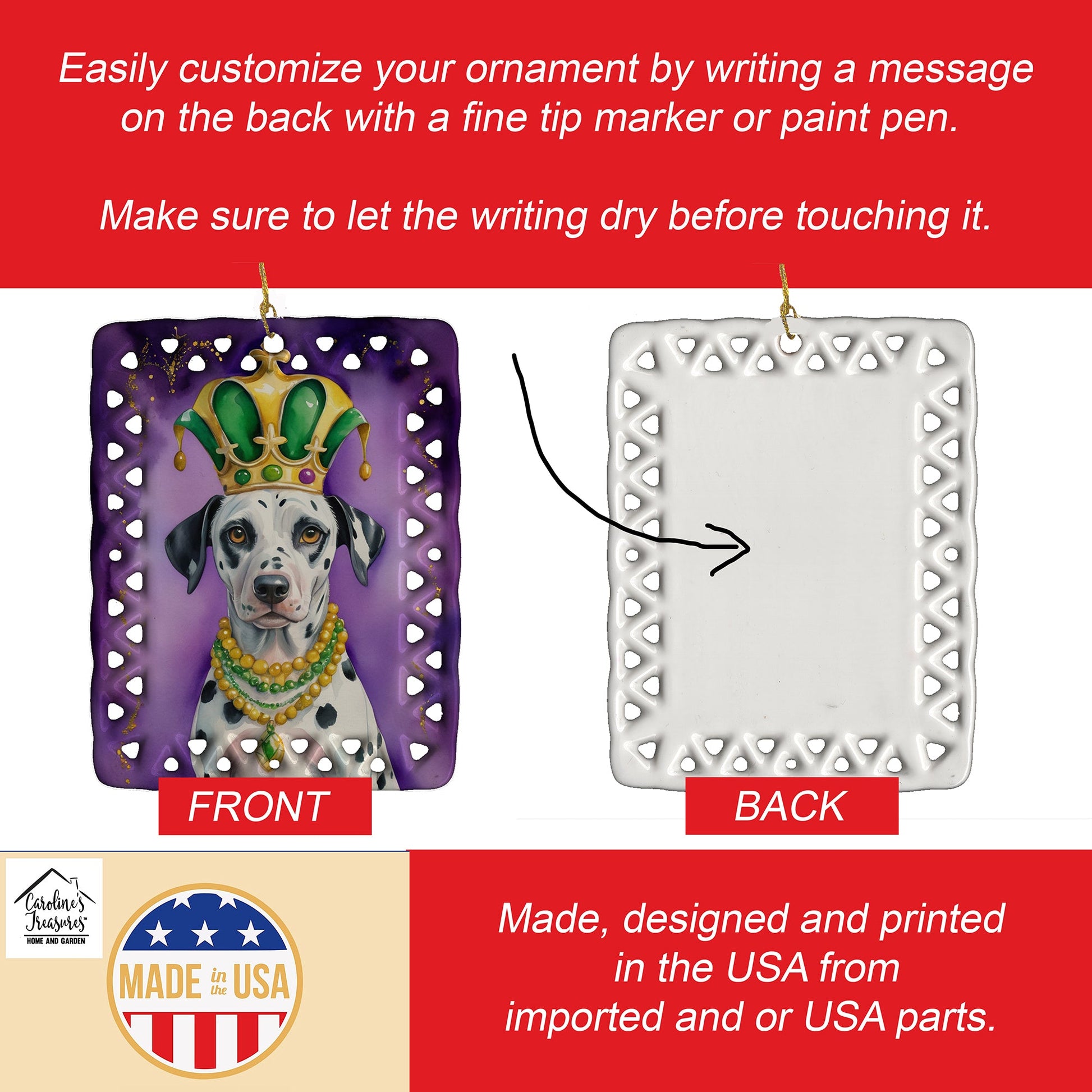Porcelain Ornament featuring breed specific Dalmatian artwork. Celebrate Mardi Gras with this Mardi Gras Ornament. Add a unique, personal touch to your holiday decor with our Rectangular Lattice Porcelain Ornament. Perfect for creating cherished memories, this high-quality ornament shines under festive lights, reflecting warmth and joy throughout your Christmas tree. Crafted with a glossy finish, it showcases vibrant, full-color artwork contributed by our talented artists, ensuring your tree is adorned with a burst of color and holiday spirit. What sets this Porcelain Ornament apart is its customizable white back. Use a paint pen or permanent marker to write a heartfelt message, commemorate a special year, or mark an unforgettable date, turning this ornament into a keepsake that will be treasured for years to come. For best results, allow any personalization to dry thoroughly before handling. Each ornament comes complete with a delicate gold cord, making it easy to hang and display. Proudly made in the USA, this ornament measures 3.375 x 2.625 inches and is a thoughtful gift for pet sitters, teachers, family members, or anyone who would appreciate a little extra holiday magic. Bring style, charm, and a touch of personal meaning to your Christmas tree with this beautifully designed ornament..