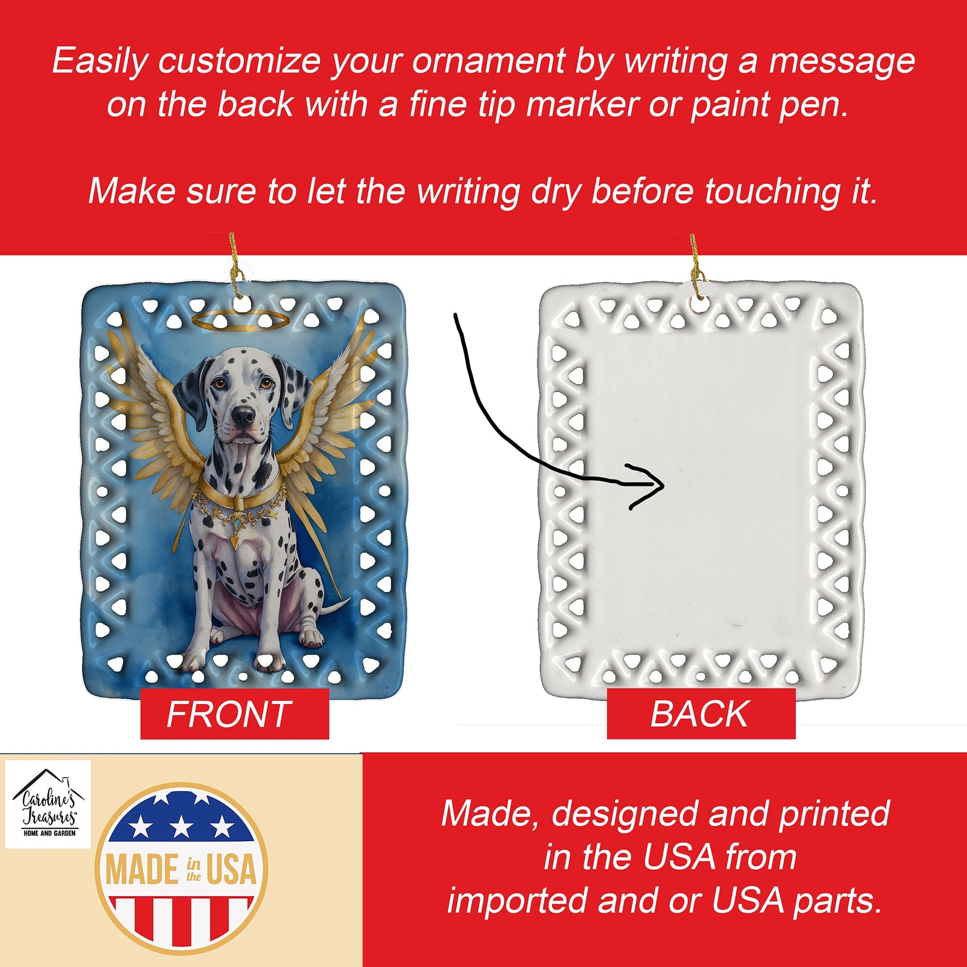 Porcelain Ornament featuring breed specific Dalmatian artwork. Celebrate Christmas with this Christmas Ornament. Add a unique, personal touch to your holiday decor with our Rectangular Lattice Porcelain Ornament. Perfect for creating cherished memories, this high-quality ornament shines under festive lights, reflecting warmth and joy throughout your Christmas tree. Crafted with a glossy finish, it showcases vibrant, full-color artwork contributed by our talented artists, ensuring your tree is adorned with a burst of color and holiday spirit. What sets this Porcelain Ornament apart is its customizable white back. Use a paint pen or permanent marker to write a heartfelt message, commemorate a special year, or mark an unforgettable date, turning this ornament into a keepsake that will be treasured for years to come. For best results, allow any personalization to dry thoroughly before handling. Each ornament comes complete with a delicate gold cord, making it easy to hang and display. Proudly made in the USA, this ornament measures 3.375 x 2.625 inches and is a thoughtful gift for pet sitters, teachers, family members, or anyone who would appreciate a little extra holiday magic. Bring style, charm, and a touch of personal meaning to your Christmas tree with this beautifully designed ornament..