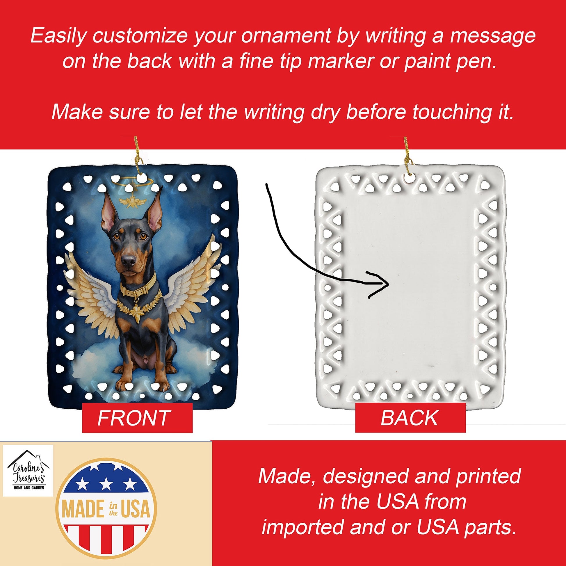 Porcelain Ornament featuring breed specific Doberman Pinscher artwork. Celebrate Christmas with this Christmas Ornament. Add a unique, personal touch to your holiday decor with our Rectangular Lattice Porcelain Ornament. Perfect for creating cherished memories, this high-quality ornament shines under festive lights, reflecting warmth and joy throughout your Christmas tree. Crafted with a glossy finish, it showcases vibrant, full-color artwork contributed by our talented artists, ensuring your tree is adorned with a burst of color and holiday spirit. What sets this Porcelain Ornament apart is its customizable white back. Use a paint pen or permanent marker to write a heartfelt message, commemorate a special year, or mark an unforgettable date, turning this ornament into a keepsake that will be treasured for years to come. For best results, allow any personalization to dry thoroughly before handling. Each ornament comes complete with a delicate gold cord, making it easy to hang and display. Proudly made in the USA, this ornament measures 3.375 x 2.625 inches and is a thoughtful gift for pet sitters, teachers, family members, or anyone who would appreciate a little extra holiday magic. Bring style, charm, and a touch of personal meaning to your Christmas tree with this beautifully designed ornament..