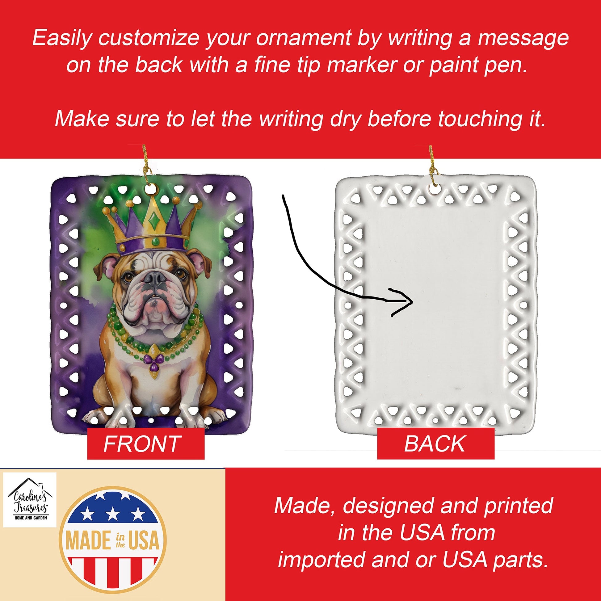Porcelain Ornament featuring breed specific English Bulldog artwork. Celebrate Mardi Gras with this Mardi Gras Ornament. Add a unique, personal touch to your holiday decor with our Rectangular Lattice Porcelain Ornament. Perfect for creating cherished memories, this high-quality ornament shines under festive lights, reflecting warmth and joy throughout your Christmas tree. Crafted with a glossy finish, it showcases vibrant, full-color artwork contributed by our talented artists, ensuring your tree is adorned with a burst of color and holiday spirit. What sets this Porcelain Ornament apart is its customizable white back. Use a paint pen or permanent marker to write a heartfelt message, commemorate a special year, or mark an unforgettable date, turning this ornament into a keepsake that will be treasured for years to come. For best results, allow any personalization to dry thoroughly before handling. Each ornament comes complete with a delicate gold cord, making it easy to hang and display. Proudly made in the USA, this ornament measures 3.375 x 2.625 inches and is a thoughtful gift for pet sitters, teachers, family members, or anyone who would appreciate a little extra holiday magic. Bring style, charm, and a touch of personal meaning to your Christmas tree with this beautifully designed ornament..