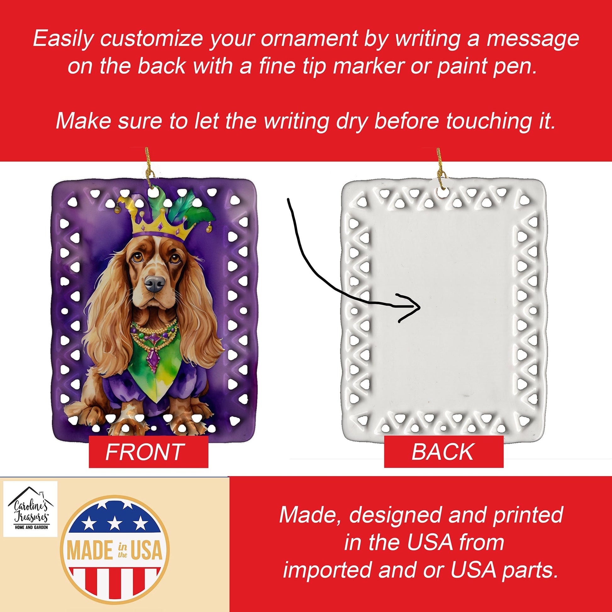 Porcelain Ornament featuring breed specific English Cocker Spaniel artwork. Celebrate Mardi Gras with this Mardi Gras Ornament. Add a unique, personal touch to your holiday decor with our Rectangular Lattice Porcelain Ornament. Perfect for creating cherished memories, this high-quality ornament shines under festive lights, reflecting warmth and joy throughout your Christmas tree. Crafted with a glossy finish, it showcases vibrant, full-color artwork contributed by our talented artists, ensuring your tree is adorned with a burst of color and holiday spirit. What sets this Porcelain Ornament apart is its customizable white back. Use a paint pen or permanent marker to write a heartfelt message, commemorate a special year, or mark an unforgettable date, turning this ornament into a keepsake that will be treasured for years to come. For best results, allow any personalization to dry thoroughly before handling. Each ornament comes complete with a delicate gold cord, making it easy to hang and display. Proudly made in the USA, this ornament measures 3.375 x 2.625 inches and is a thoughtful gift for pet sitters, teachers, family members, or anyone who would appreciate a little extra holiday magic. Bring style, charm, and a touch of personal meaning to your Christmas tree with this beautifully designed ornament..