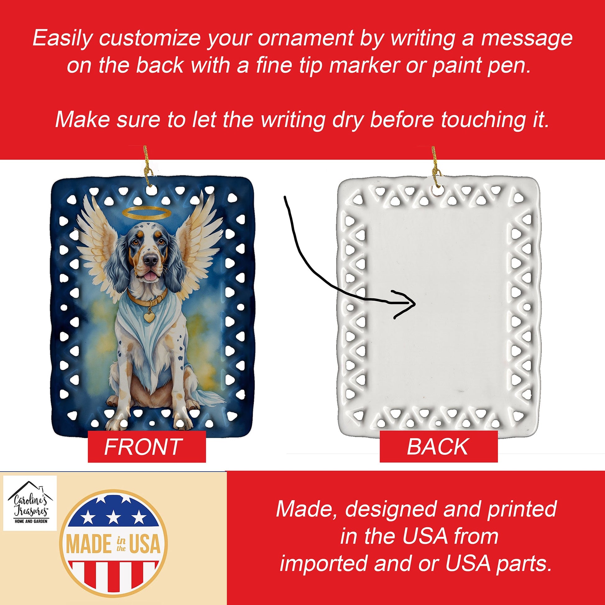 Porcelain Ornament featuring breed specific English Setter artwork. Celebrate Christmas with this Christmas Ornament. Add a unique, personal touch to your holiday decor with our Rectangular Lattice Porcelain Ornament. Perfect for creating cherished memories, this high-quality ornament shines under festive lights, reflecting warmth and joy throughout your Christmas tree. Crafted with a glossy finish, it showcases vibrant, full-color artwork contributed by our talented artists, ensuring your tree is adorned with a burst of color and holiday spirit. What sets this Porcelain Ornament apart is its customizable white back. Use a paint pen or permanent marker to write a heartfelt message, commemorate a special year, or mark an unforgettable date, turning this ornament into a keepsake that will be treasured for years to come. For best results, allow any personalization to dry thoroughly before handling. Each ornament comes complete with a delicate gold cord, making it easy to hang and display. Proudly made in the USA, this ornament measures 3.375 x 2.625 inches and is a thoughtful gift for pet sitters, teachers, family members, or anyone who would appreciate a little extra holiday magic. Bring style, charm, and a touch of personal meaning to your Christmas tree with this beautifully designed ornament..