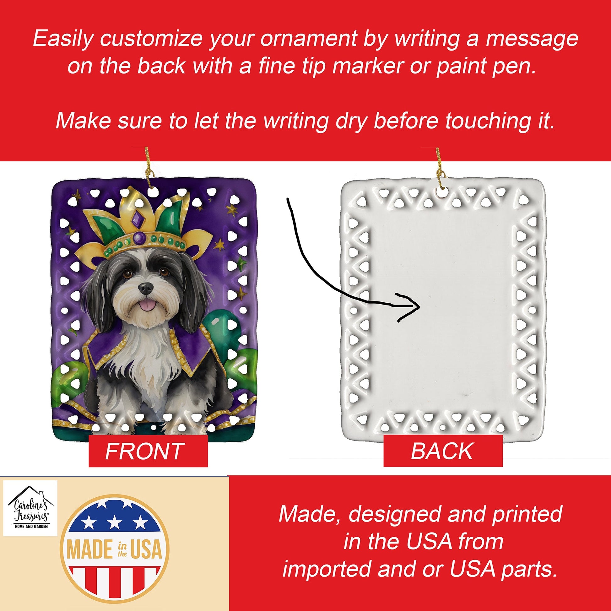 Porcelain Ornament featuring breed specific Havanese artwork. Celebrate Mardi Gras with this Mardi Gras Ornament. Add a unique, personal touch to your holiday decor with our Rectangular Lattice Porcelain Ornament. Perfect for creating cherished memories, this high-quality ornament shines under festive lights, reflecting warmth and joy throughout your Christmas tree. Crafted with a glossy finish, it showcases vibrant, full-color artwork contributed by our talented artists, ensuring your tree is adorned with a burst of color and holiday spirit. What sets this Porcelain Ornament apart is its customizable white back. Use a paint pen or permanent marker to write a heartfelt message, commemorate a special year, or mark an unforgettable date, turning this ornament into a keepsake that will be treasured for years to come. For best results, allow any personalization to dry thoroughly before handling. Each ornament comes complete with a delicate gold cord, making it easy to hang and display. Proudly made in the USA, this ornament measures 3.375 x 2.625 inches and is a thoughtful gift for pet sitters, teachers, family members, or anyone who would appreciate a little extra holiday magic. Bring style, charm, and a touch of personal meaning to your Christmas tree with this beautifully designed ornament..