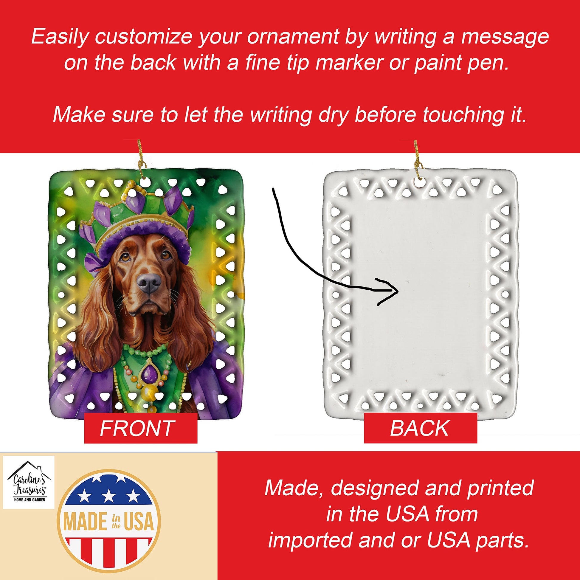 Porcelain Ornament featuring breed specific Irish Setter artwork. Celebrate Mardi Gras with this Mardi Gras Ornament. Add a unique, personal touch to your holiday decor with our Rectangular Lattice Porcelain Ornament. Perfect for creating cherished memories, this high-quality ornament shines under festive lights, reflecting warmth and joy throughout your Christmas tree. Crafted with a glossy finish, it showcases vibrant, full-color artwork contributed by our talented artists, ensuring your tree is adorned with a burst of color and holiday spirit. What sets this Porcelain Ornament apart is its customizable white back. Use a paint pen or permanent marker to write a heartfelt message, commemorate a special year, or mark an unforgettable date, turning this ornament into a keepsake that will be treasured for years to come. For best results, allow any personalization to dry thoroughly before handling. Each ornament comes complete with a delicate gold cord, making it easy to hang and display. Proudly made in the USA, this ornament measures 3.375 x 2.625 inches and is a thoughtful gift for pet sitters, teachers, family members, or anyone who would appreciate a little extra holiday magic. Bring style, charm, and a touch of personal meaning to your Christmas tree with this beautifully designed ornament..
