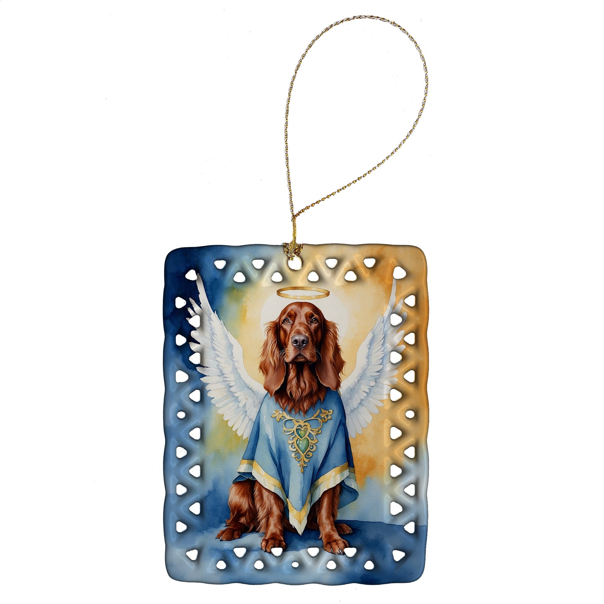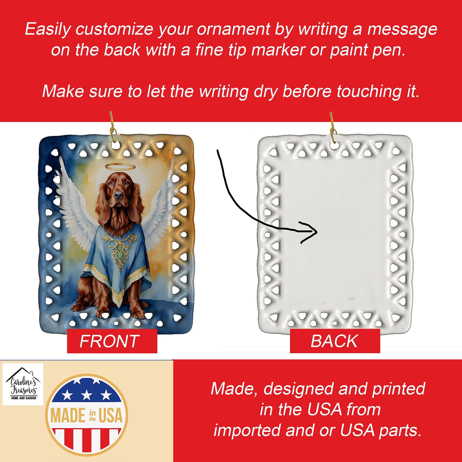 Porcelain Ornament featuring breed specific Irish Setter artwork. Celebrate Christmas with this Christmas Ornament. Add a unique, personal touch to your holiday decor with our Rectangular Lattice Porcelain Ornament. Perfect for creating cherished memories, this high-quality ornament shines under festive lights, reflecting warmth and joy throughout your Christmas tree. Crafted with a glossy finish, it showcases vibrant, full-color artwork contributed by our talented artists, ensuring your tree is adorned with a burst of color and holiday spirit. What sets this Porcelain Ornament apart is its customizable white back. Use a paint pen or permanent marker to write a heartfelt message, commemorate a special year, or mark an unforgettable date, turning this ornament into a keepsake that will be treasured for years to come. For best results, allow any personalization to dry thoroughly before handling. Each ornament comes complete with a delicate gold cord, making it easy to hang and display. Proudly made in the USA, this ornament measures 3.375 x 2.625 inches and is a thoughtful gift for pet sitters, teachers, family members, or anyone who would appreciate a little extra holiday magic. Bring style, charm, and a touch of personal meaning to your Christmas tree with this beautifully designed ornament..
