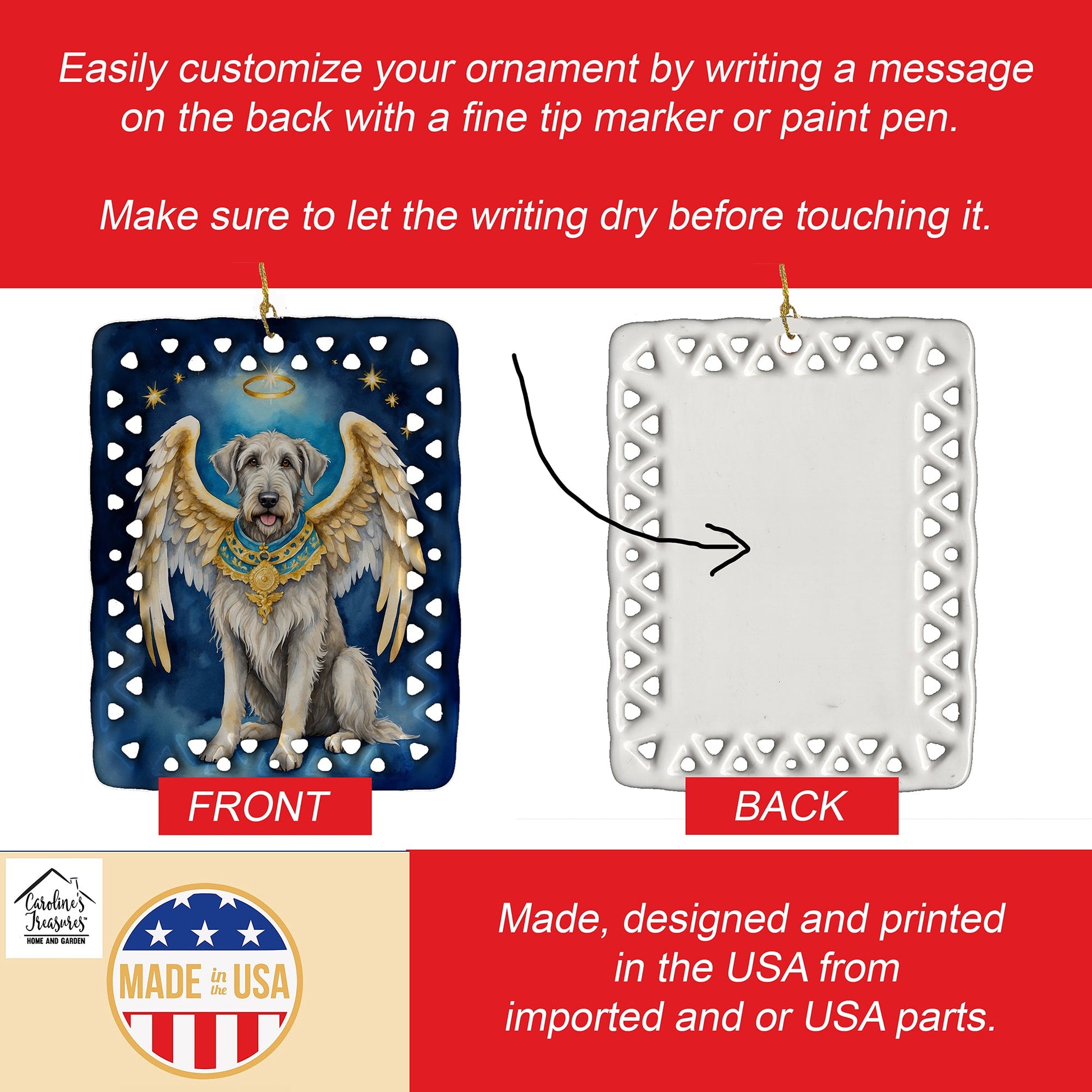 Porcelain Ornament featuring breed specific Irish Wolfhound artwork. Celebrate Christmas with this Christmas Ornament. Add a unique, personal touch to your holiday decor with our Rectangular Lattice Porcelain Ornament. Perfect for creating cherished memories, this high-quality ornament shines under festive lights, reflecting warmth and joy throughout your Christmas tree. Crafted with a glossy finish, it showcases vibrant, full-color artwork contributed by our talented artists, ensuring your tree is adorned with a burst of color and holiday spirit. What sets this Porcelain Ornament apart is its customizable white back. Use a paint pen or permanent marker to write a heartfelt message, commemorate a special year, or mark an unforgettable date, turning this ornament into a keepsake that will be treasured for years to come. For best results, allow any personalization to dry thoroughly before handling. Each ornament comes complete with a delicate gold cord, making it easy to hang and display. Proudly made in the USA, this ornament measures 3.375 x 2.625 inches and is a thoughtful gift for pet sitters, teachers, family members, or anyone who would appreciate a little extra holiday magic. Bring style, charm, and a touch of personal meaning to your Christmas tree with this beautifully designed ornament..
