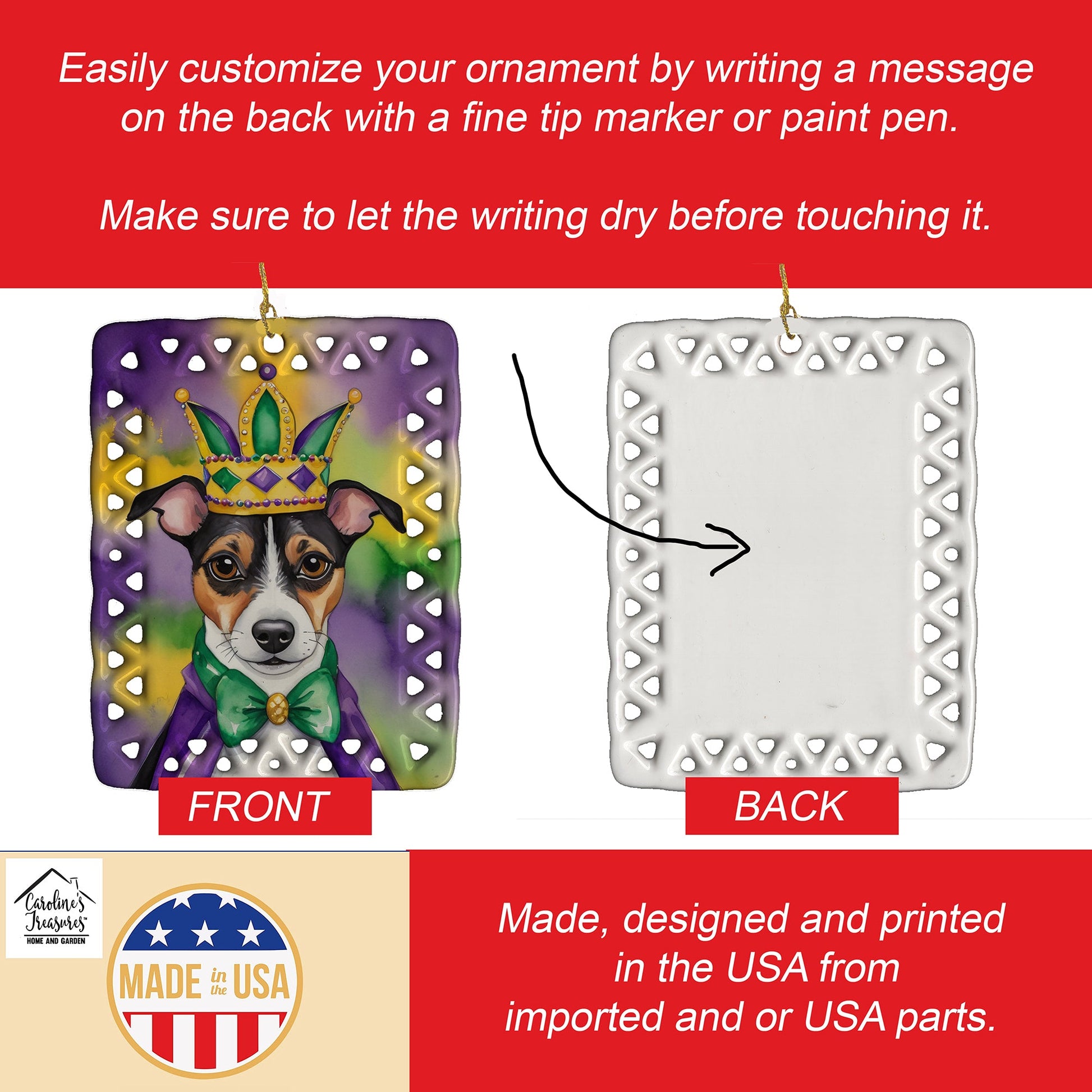Porcelain Ornament featuring breed specific Jack Russell Terrier artwork. Celebrate Mardi Gras with this Mardi Gras Ornament. Add a unique, personal touch to your holiday decor with our Rectangular Lattice Porcelain Ornament. Perfect for creating cherished memories, this high-quality ornament shines under festive lights, reflecting warmth and joy throughout your Christmas tree. Crafted with a glossy finish, it showcases vibrant, full-color artwork contributed by our talented artists, ensuring your tree is adorned with a burst of color and holiday spirit. What sets this Porcelain Ornament apart is its customizable white back. Use a paint pen or permanent marker to write a heartfelt message, commemorate a special year, or mark an unforgettable date, turning this ornament into a keepsake that will be treasured for years to come. For best results, allow any personalization to dry thoroughly before handling. Each ornament comes complete with a delicate gold cord, making it easy to hang and display. Proudly made in the USA, this ornament measures 3.375 x 2.625 inches and is a thoughtful gift for pet sitters, teachers, family members, or anyone who would appreciate a little extra holiday magic. Bring style, charm, and a touch of personal meaning to your Christmas tree with this beautifully designed ornament..