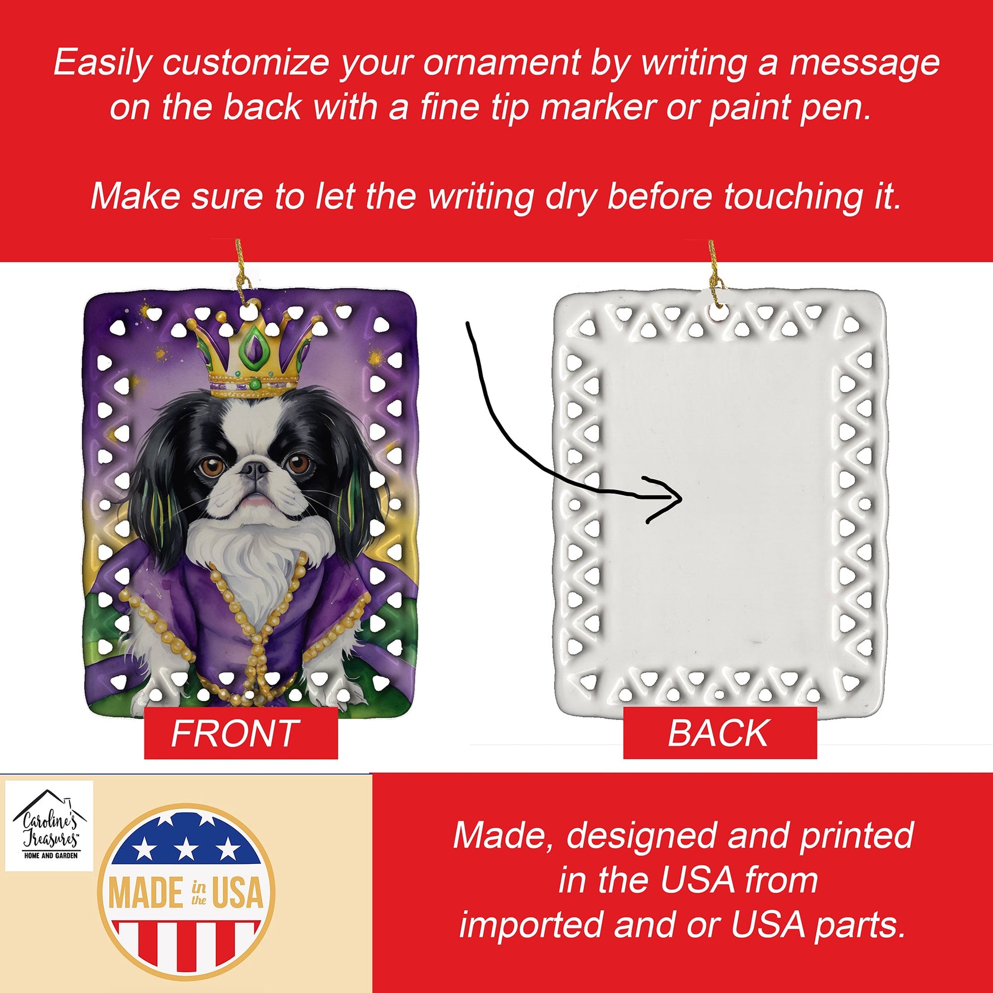 Porcelain Ornament featuring breed specific Japanese Chin artwork. Celebrate Mardi Gras with this Mardi Gras Ornament. Add a unique, personal touch to your holiday decor with our Rectangular Lattice Porcelain Ornament. Perfect for creating cherished memories, this high-quality ornament shines under festive lights, reflecting warmth and joy throughout your Christmas tree. Crafted with a glossy finish, it showcases vibrant, full-color artwork contributed by our talented artists, ensuring your tree is adorned with a burst of color and holiday spirit. What sets this Porcelain Ornament apart is its customizable white back. Use a paint pen or permanent marker to write a heartfelt message, commemorate a special year, or mark an unforgettable date, turning this ornament into a keepsake that will be treasured for years to come. For best results, allow any personalization to dry thoroughly before handling. Each ornament comes complete with a delicate gold cord, making it easy to hang and display. Proudly made in the USA, this ornament measures 3.375 x 2.625 inches and is a thoughtful gift for pet sitters, teachers, family members, or anyone who would appreciate a little extra holiday magic. Bring style, charm, and a touch of personal meaning to your Christmas tree with this beautifully designed ornament..