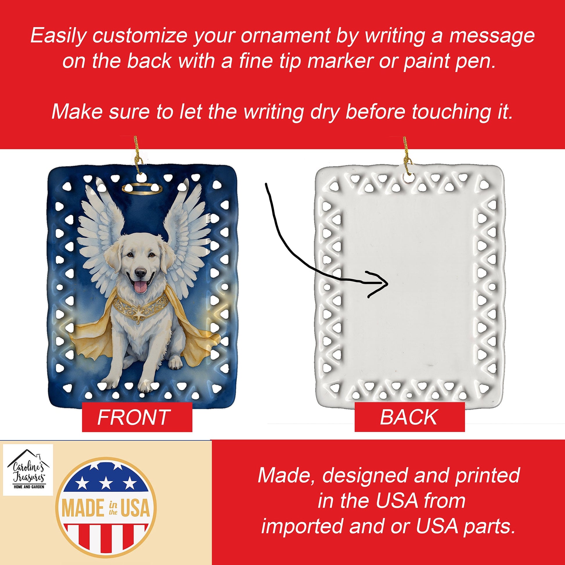 Porcelain Ornament featuring breed specific Kuvasz artwork. Celebrate Christmas with this Christmas Ornament. Add a unique, personal touch to your holiday decor with our Rectangular Lattice Porcelain Ornament. Perfect for creating cherished memories, this high-quality ornament shines under festive lights, reflecting warmth and joy throughout your Christmas tree. Crafted with a glossy finish, it showcases vibrant, full-color artwork contributed by our talented artists, ensuring your tree is adorned with a burst of color and holiday spirit. What sets this Porcelain Ornament apart is its customizable white back. Use a paint pen or permanent marker to write a heartfelt message, commemorate a special year, or mark an unforgettable date, turning this ornament into a keepsake that will be treasured for years to come. For best results, allow any personalization to dry thoroughly before handling. Each ornament comes complete with a delicate gold cord, making it easy to hang and display. Proudly made in the USA, this ornament measures 3.375 x 2.625 inches and is a thoughtful gift for pet sitters, teachers, family members, or anyone who would appreciate a little extra holiday magic. Bring style, charm, and a touch of personal meaning to your Christmas tree with this beautifully designed ornament..