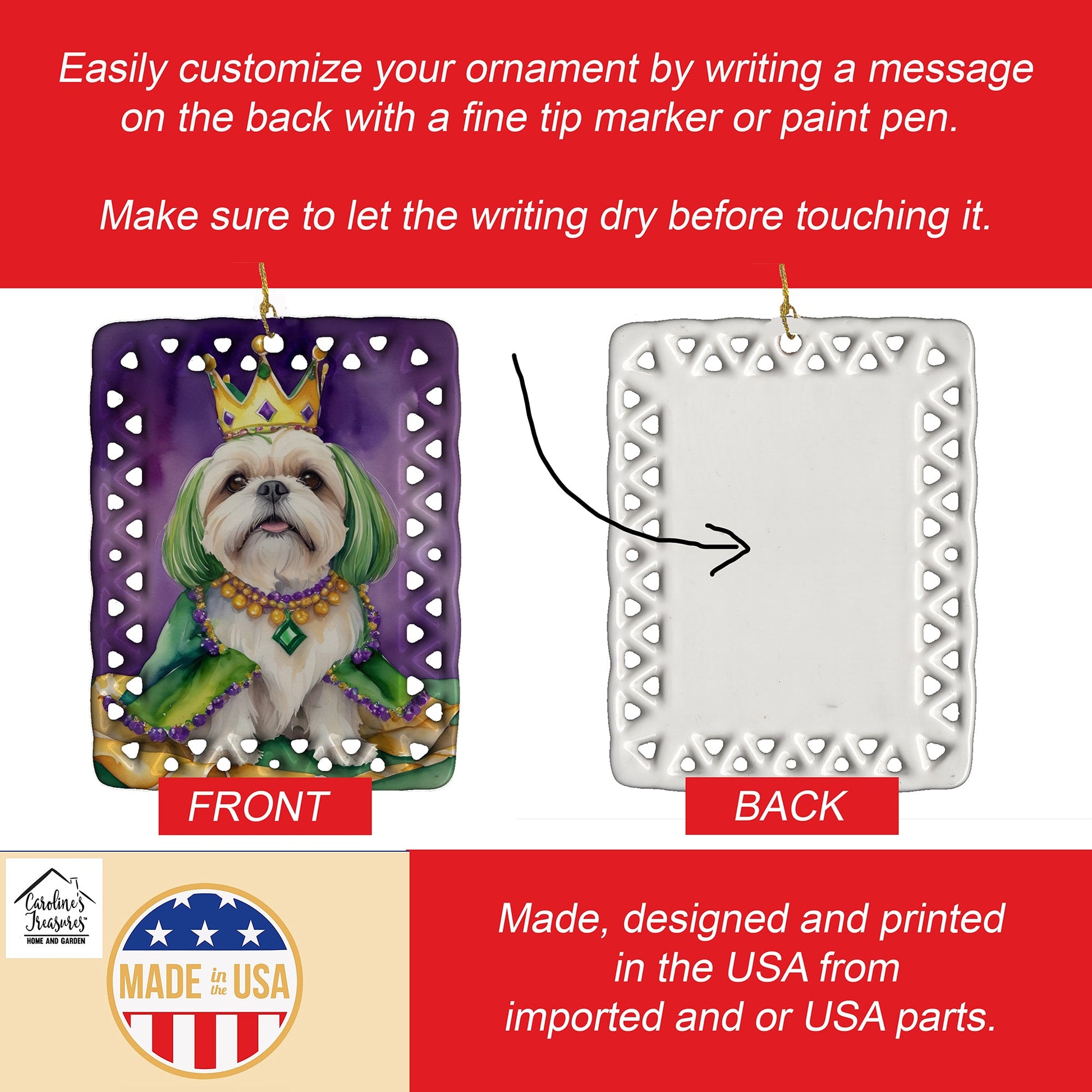 Porcelain Ornament featuring breed specific Lhasa Apso artwork. Celebrate Mardi Gras with this Mardi Gras Ornament. Add a unique, personal touch to your holiday decor with our Rectangular Lattice Porcelain Ornament. Perfect for creating cherished memories, this high-quality ornament shines under festive lights, reflecting warmth and joy throughout your Christmas tree. Crafted with a glossy finish, it showcases vibrant, full-color artwork contributed by our talented artists, ensuring your tree is adorned with a burst of color and holiday spirit. What sets this Porcelain Ornament apart is its customizable white back. Use a paint pen or permanent marker to write a heartfelt message, commemorate a special year, or mark an unforgettable date, turning this ornament into a keepsake that will be treasured for years to come. For best results, allow any personalization to dry thoroughly before handling. Each ornament comes complete with a delicate gold cord, making it easy to hang and display. Proudly made in the USA, this ornament measures 3.375 x 2.625 inches and is a thoughtful gift for pet sitters, teachers, family members, or anyone who would appreciate a little extra holiday magic. Bring style, charm, and a touch of personal meaning to your Christmas tree with this beautifully designed ornament..
