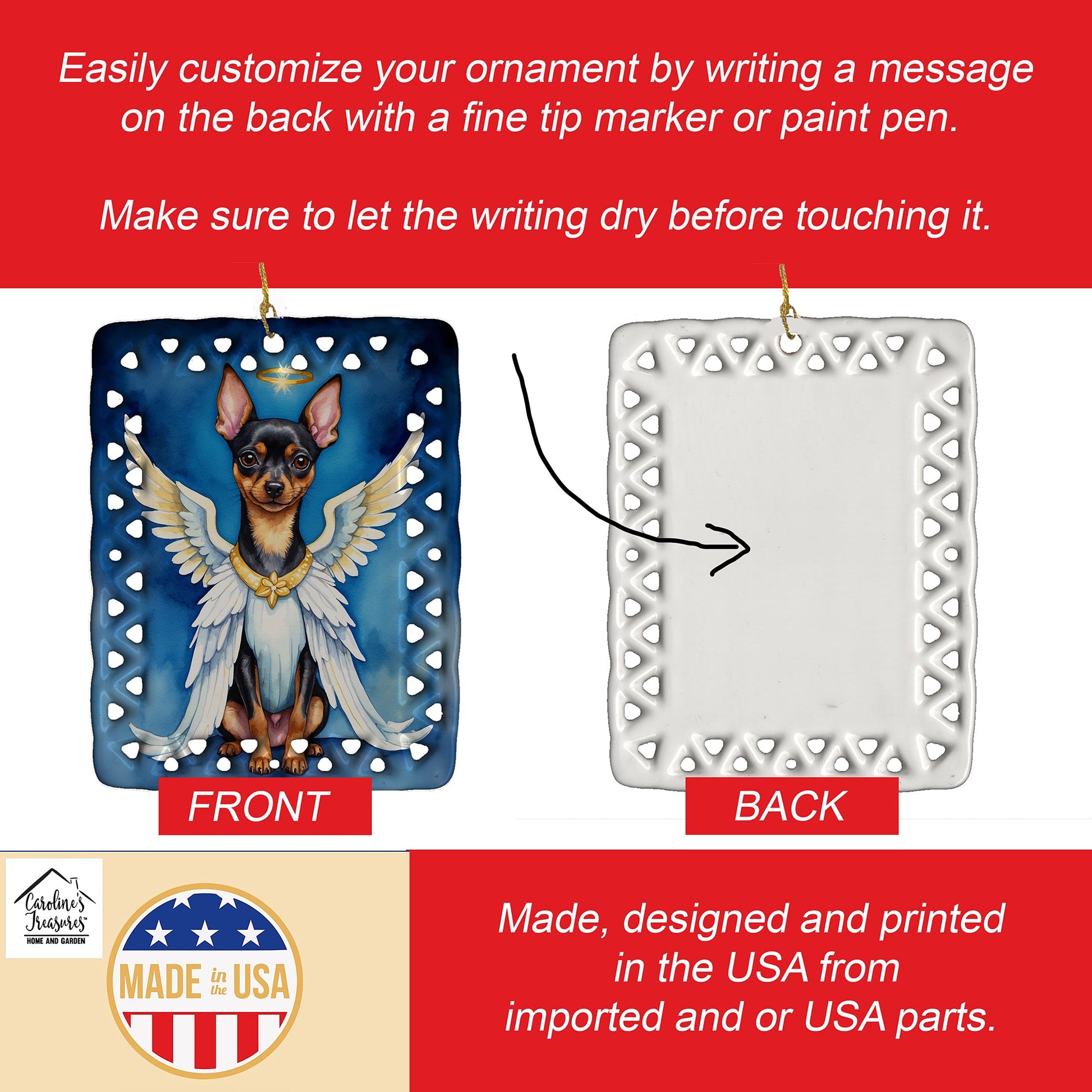 Porcelain Ornament featuring breed specific Miniature Pinscher artwork. Celebrate Christmas with this Christmas Ornament. Add a unique, personal touch to your holiday decor with our Rectangular Lattice Porcelain Ornament. Perfect for creating cherished memories, this high-quality ornament shines under festive lights, reflecting warmth and joy throughout your Christmas tree. Crafted with a glossy finish, it showcases vibrant, full-color artwork contributed by our talented artists, ensuring your tree is adorned with a burst of color and holiday spirit. What sets this Porcelain Ornament apart is its customizable white back. Use a paint pen or permanent marker to write a heartfelt message, commemorate a special year, or mark an unforgettable date, turning this ornament into a keepsake that will be treasured for years to come. For best results, allow any personalization to dry thoroughly before handling. Each ornament comes complete with a delicate gold cord, making it easy to hang and display. Proudly made in the USA, this ornament measures 3.375 x 2.625 inches and is a thoughtful gift for pet sitters, teachers, family members, or anyone who would appreciate a little extra holiday magic. Bring style, charm, and a touch of personal meaning to your Christmas tree with this beautifully designed ornament..