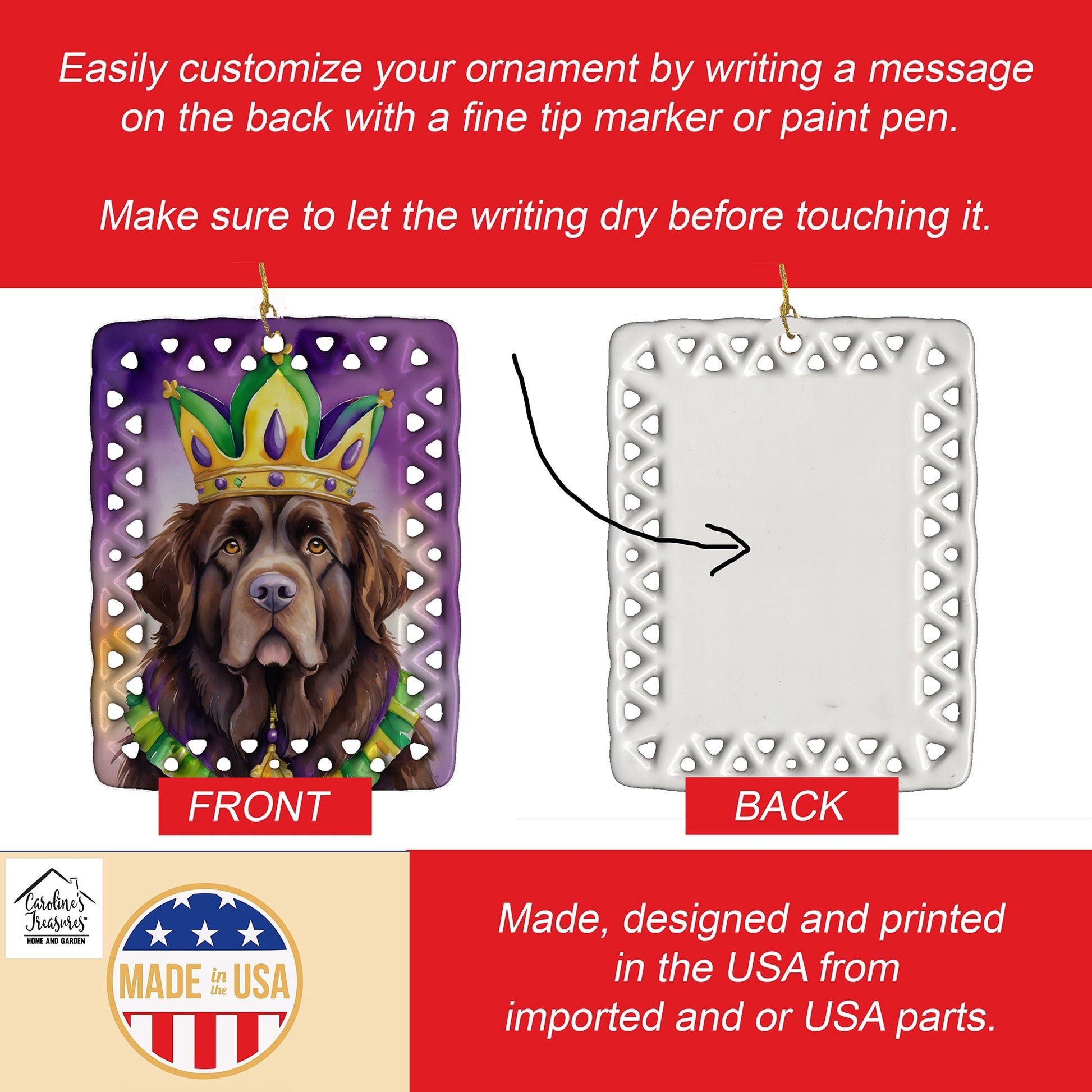Porcelain Ornament featuring breed specific Newfoundland artwork. Celebrate Mardi Gras with this Mardi Gras Ornament. Add a unique, personal touch to your holiday decor with our Rectangular Lattice Porcelain Ornament. Perfect for creating cherished memories, this high-quality ornament shines under festive lights, reflecting warmth and joy throughout your Christmas tree. Crafted with a glossy finish, it showcases vibrant, full-color artwork contributed by our talented artists, ensuring your tree is adorned with a burst of color and holiday spirit. What sets this Porcelain Ornament apart is its customizable white back. Use a paint pen or permanent marker to write a heartfelt message, commemorate a special year, or mark an unforgettable date, turning this ornament into a keepsake that will be treasured for years to come. For best results, allow any personalization to dry thoroughly before handling. Each ornament comes complete with a delicate gold cord, making it easy to hang and display. Proudly made in the USA, this ornament measures 3.375 x 2.625 inches and is a thoughtful gift for pet sitters, teachers, family members, or anyone who would appreciate a little extra holiday magic. Bring style, charm, and a touch of personal meaning to your Christmas tree with this beautifully designed ornament..