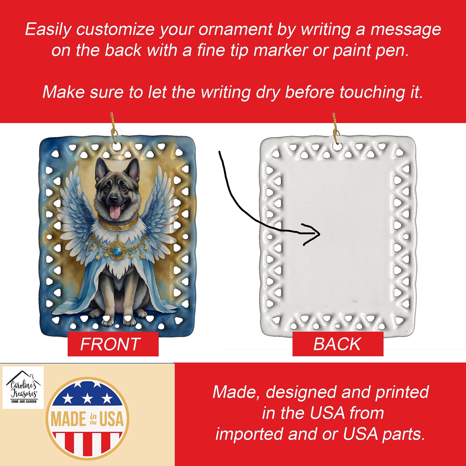 Porcelain Ornament featuring breed specific Norwegian Elkhound artwork. Celebrate Christmas with this Christmas Ornament. Add a unique, personal touch to your holiday decor with our Rectangular Lattice Porcelain Ornament. Perfect for creating cherished memories, this high-quality ornament shines under festive lights, reflecting warmth and joy throughout your Christmas tree. Crafted with a glossy finish, it showcases vibrant, full-color artwork contributed by our talented artists, ensuring your tree is adorned with a burst of color and holiday spirit. What sets this Porcelain Ornament apart is its customizable white back. Use a paint pen or permanent marker to write a heartfelt message, commemorate a special year, or mark an unforgettable date, turning this ornament into a keepsake that will be treasured for years to come. For best results, allow any personalization to dry thoroughly before handling. Each ornament comes complete with a delicate gold cord, making it easy to hang and display. Proudly made in the USA, this ornament measures 3.375 x 2.625 inches and is a thoughtful gift for pet sitters, teachers, family members, or anyone who would appreciate a little extra holiday magic. Bring style, charm, and a touch of personal meaning to your Christmas tree with this beautifully designed ornament..