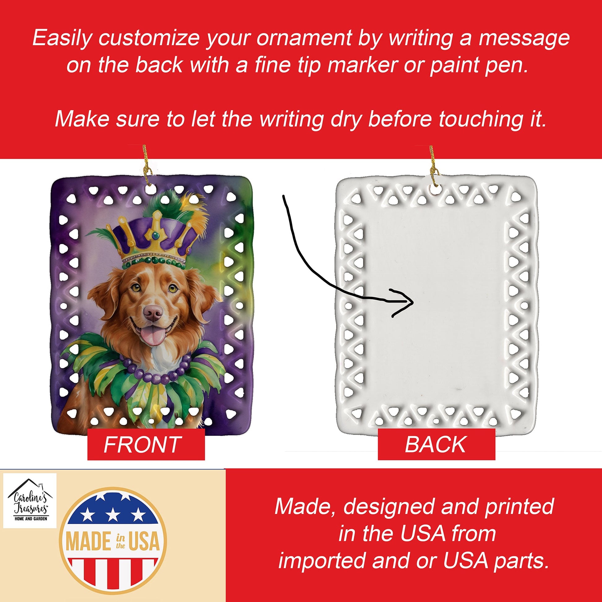 Porcelain Ornament featuring breed specific Nova Scotia Duck Tolling Retriever artwork. Celebrate Mardi Gras with this Mardi Gras Ornament. Add a unique, personal touch to your holiday decor with our Rectangular Lattice Porcelain Ornament. Perfect for creating cherished memories, this high-quality ornament shines under festive lights, reflecting warmth and joy throughout your Christmas tree. Crafted with a glossy finish, it showcases vibrant, full-color artwork contributed by our talented artists, ensuring your tree is adorned with a burst of color and holiday spirit. What sets this Porcelain Ornament apart is its customizable white back. Use a paint pen or permanent marker to write a heartfelt message, commemorate a special year, or mark an unforgettable date, turning this ornament into a keepsake that will be treasured for years to come. For best results, allow any personalization to dry thoroughly before handling. Each ornament comes complete with a delicate gold cord, making it easy to hang and display. Proudly made in the USA, this ornament measures 3.375 x 2.625 inches and is a thoughtful gift for pet sitters, teachers, family members, or anyone who would appreciate a little extra holiday magic. Bring style, charm, and a touch of personal meaning to your Christmas tree with this beautifully designed ornament..