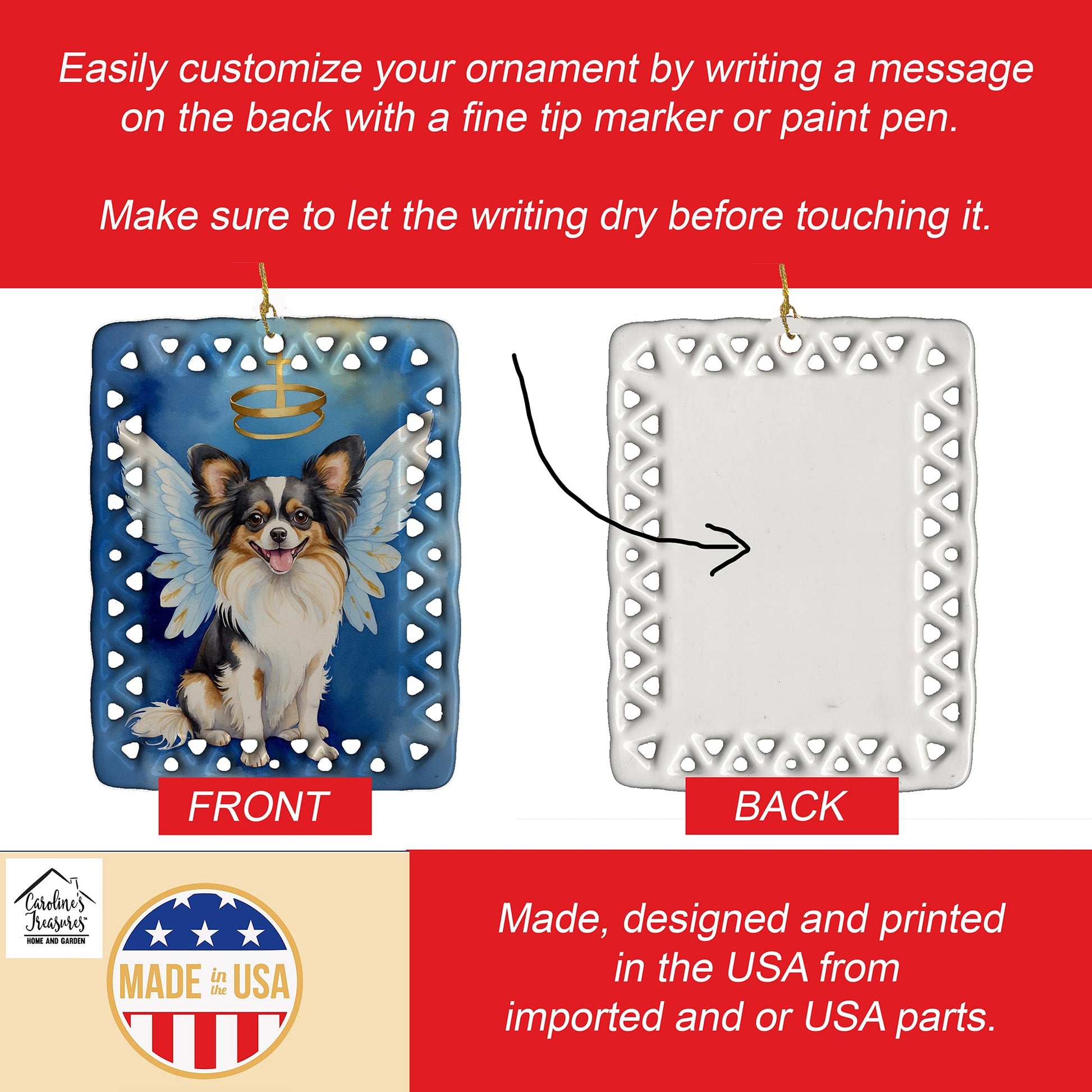 Porcelain Ornament featuring breed specific Papillon artwork. Celebrate Christmas with this Christmas Ornament. Add a unique, personal touch to your holiday decor with our Rectangular Lattice Porcelain Ornament. Perfect for creating cherished memories, this high-quality ornament shines under festive lights, reflecting warmth and joy throughout your Christmas tree. Crafted with a glossy finish, it showcases vibrant, full-color artwork contributed by our talented artists, ensuring your tree is adorned with a burst of color and holiday spirit. What sets this Porcelain Ornament apart is its customizable white back. Use a paint pen or permanent marker to write a heartfelt message, commemorate a special year, or mark an unforgettable date, turning this ornament into a keepsake that will be treasured for years to come. For best results, allow any personalization to dry thoroughly before handling. Each ornament comes complete with a delicate gold cord, making it easy to hang and display. Proudly made in the USA, this ornament measures 3.375 x 2.625 inches and is a thoughtful gift for pet sitters, teachers, family members, or anyone who would appreciate a little extra holiday magic. Bring style, charm, and a touch of personal meaning to your Christmas tree with this beautifully designed ornament..