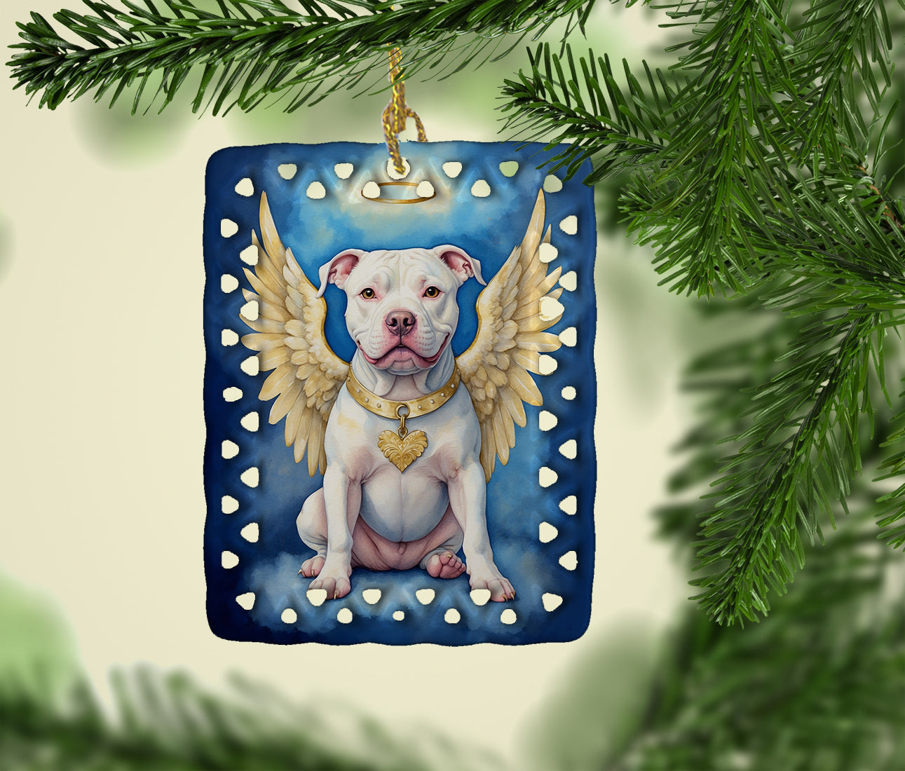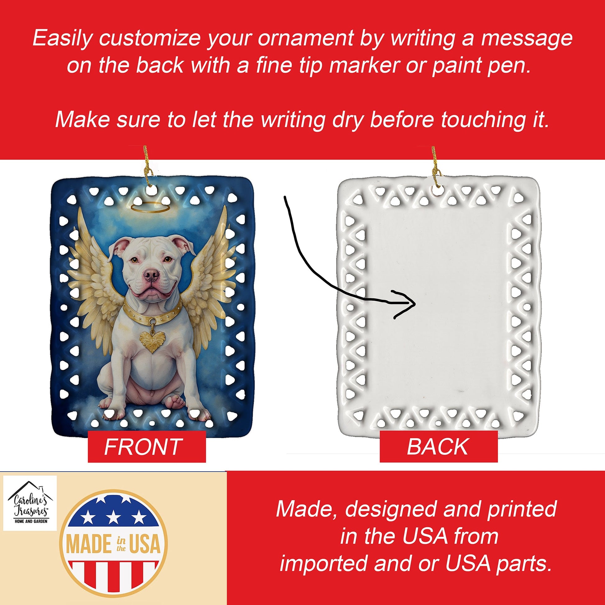 Porcelain Ornament featuring breed specific Pit Bull Terrier artwork. Celebrate Christmas with this Christmas Ornament. Add a unique, personal touch to your holiday decor with our Rectangular Lattice Porcelain Ornament. Perfect for creating cherished memories, this high-quality ornament shines under festive lights, reflecting warmth and joy throughout your Christmas tree. Crafted with a glossy finish, it showcases vibrant, full-color artwork contributed by our talented artists, ensuring your tree is adorned with a burst of color and holiday spirit. What sets this Porcelain Ornament apart is its customizable white back. Use a paint pen or permanent marker to write a heartfelt message, commemorate a special year, or mark an unforgettable date, turning this ornament into a keepsake that will be treasured for years to come. For best results, allow any personalization to dry thoroughly before handling. Each ornament comes complete with a delicate gold cord, making it easy to hang and display. Proudly made in the USA, this ornament measures 3.375 x 2.625 inches and is a thoughtful gift for pet sitters, teachers, family members, or anyone who would appreciate a little extra holiday magic. Bring style, charm, and a touch of personal meaning to your Christmas tree with this beautifully designed ornament..