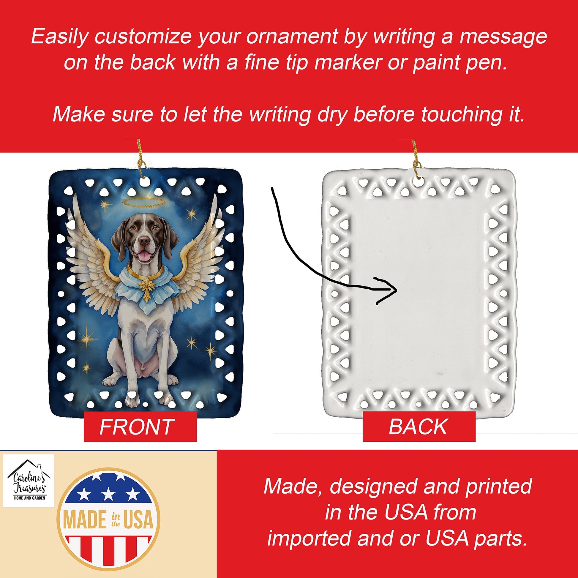 Porcelain Ornament featuring breed specific Pointer artwork. Celebrate Christmas with this Christmas Ornament. Add a unique, personal touch to your holiday decor with our Rectangular Lattice Porcelain Ornament. Perfect for creating cherished memories, this high-quality ornament shines under festive lights, reflecting warmth and joy throughout your Christmas tree. Crafted with a glossy finish, it showcases vibrant, full-color artwork contributed by our talented artists, ensuring your tree is adorned with a burst of color and holiday spirit. What sets this Porcelain Ornament apart is its customizable white back. Use a paint pen or permanent marker to write a heartfelt message, commemorate a special year, or mark an unforgettable date, turning this ornament into a keepsake that will be treasured for years to come. For best results, allow any personalization to dry thoroughly before handling. Each ornament comes complete with a delicate gold cord, making it easy to hang and display. Proudly made in the USA, this ornament measures 3.375 x 2.625 inches and is a thoughtful gift for pet sitters, teachers, family members, or anyone who would appreciate a little extra holiday magic. Bring style, charm, and a touch of personal meaning to your Christmas tree with this beautifully designed ornament..