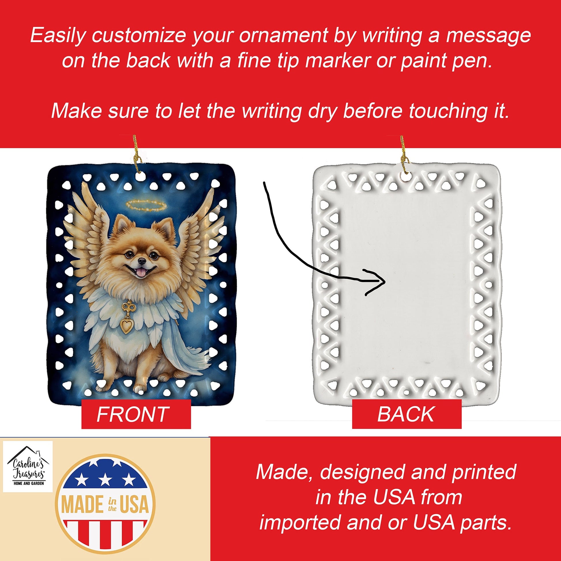 Porcelain Ornament featuring breed specific Pomeranian artwork. Celebrate Christmas with this Christmas Ornament. Add a unique, personal touch to your holiday decor with our Rectangular Lattice Porcelain Ornament. Perfect for creating cherished memories, this high-quality ornament shines under festive lights, reflecting warmth and joy throughout your Christmas tree. Crafted with a glossy finish, it showcases vibrant, full-color artwork contributed by our talented artists, ensuring your tree is adorned with a burst of color and holiday spirit. What sets this Porcelain Ornament apart is its customizable white back. Use a paint pen or permanent marker to write a heartfelt message, commemorate a special year, or mark an unforgettable date, turning this ornament into a keepsake that will be treasured for years to come. For best results, allow any personalization to dry thoroughly before handling. Each ornament comes complete with a delicate gold cord, making it easy to hang and display. Proudly made in the USA, this ornament measures 3.375 x 2.625 inches and is a thoughtful gift for pet sitters, teachers, family members, or anyone who would appreciate a little extra holiday magic. Bring style, charm, and a touch of personal meaning to your Christmas tree with this beautifully designed ornament..