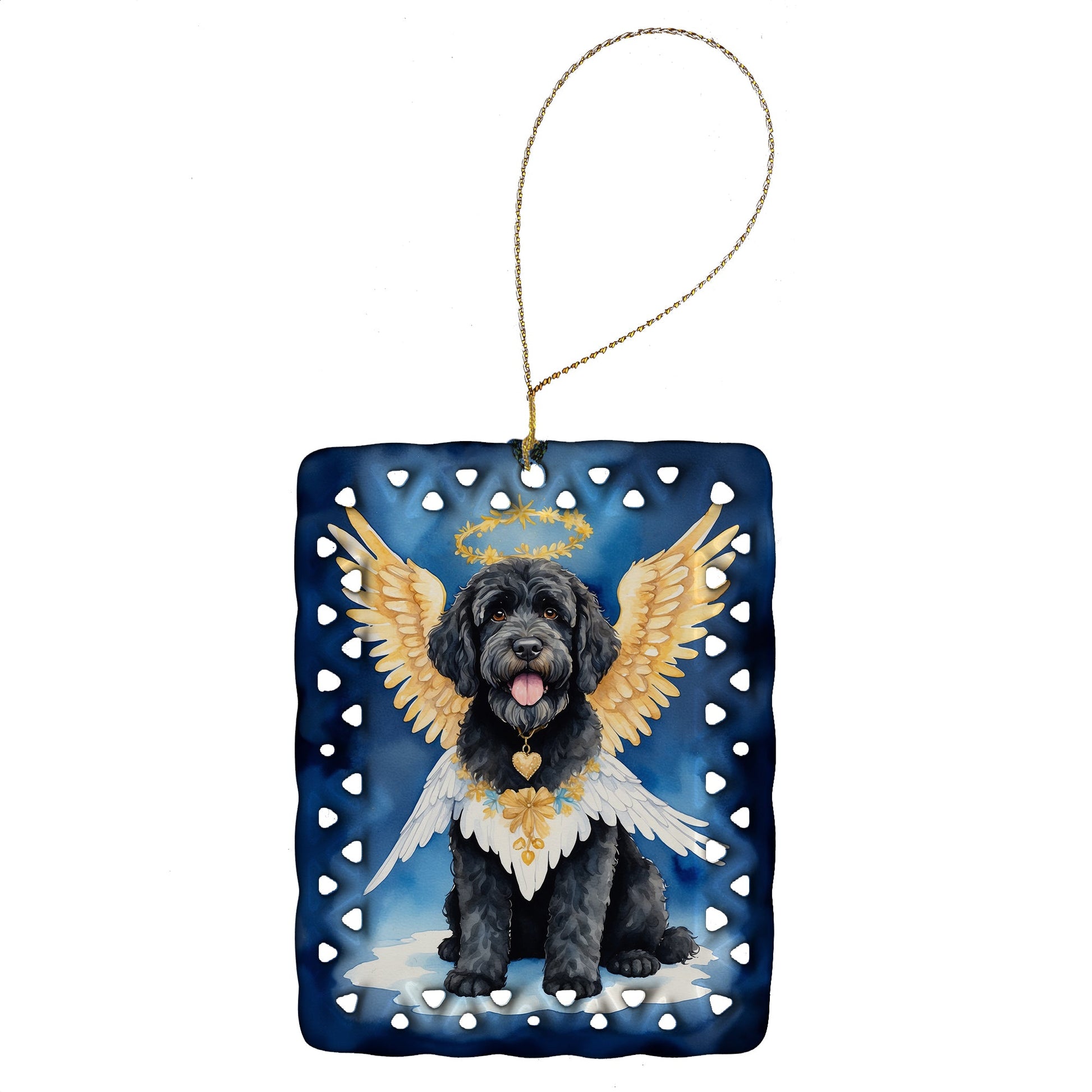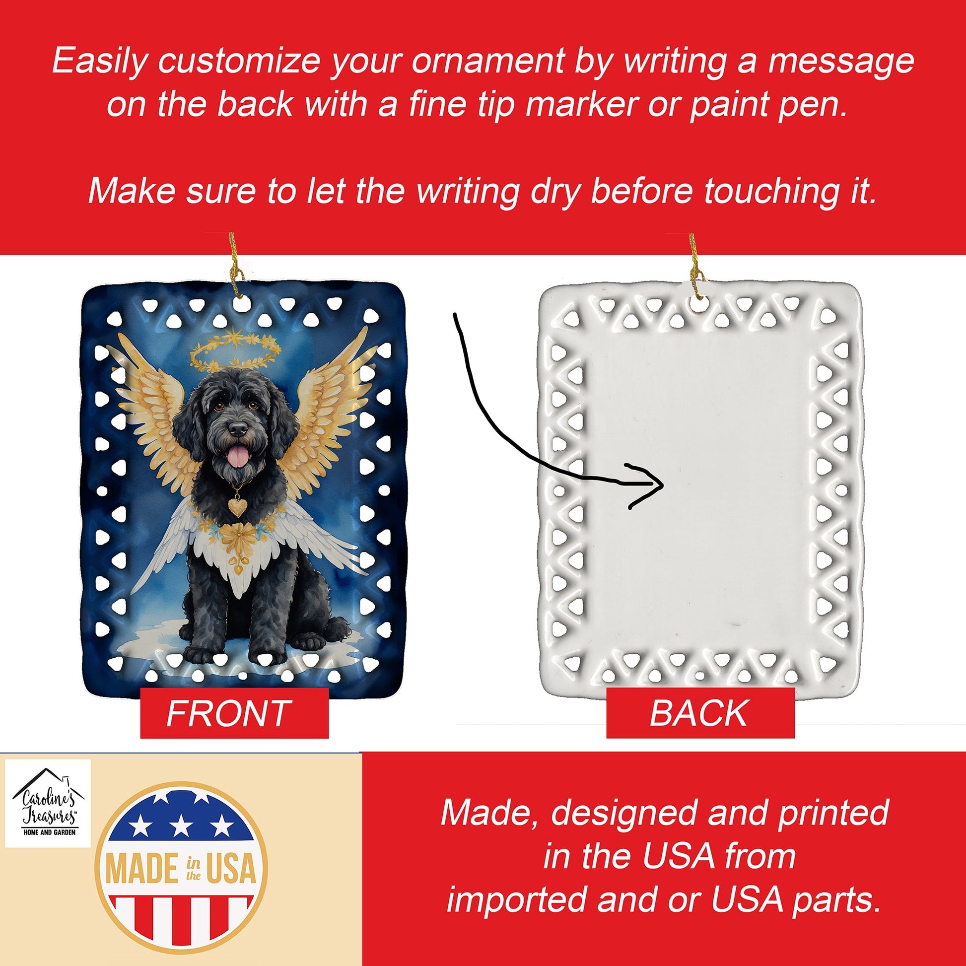 Porcelain Ornament featuring breed specific Portuguese Water Dog artwork. Celebrate Christmas with this Christmas Ornament. Add a unique, personal touch to your holiday decor with our Rectangular Lattice Porcelain Ornament. Perfect for creating cherished memories, this high-quality ornament shines under festive lights, reflecting warmth and joy throughout your Christmas tree. Crafted with a glossy finish, it showcases vibrant, full-color artwork contributed by our talented artists, ensuring your tree is adorned with a burst of color and holiday spirit. What sets this Porcelain Ornament apart is its customizable white back. Use a paint pen or permanent marker to write a heartfelt message, commemorate a special year, or mark an unforgettable date, turning this ornament into a keepsake that will be treasured for years to come. For best results, allow any personalization to dry thoroughly before handling. Each ornament comes complete with a delicate gold cord, making it easy to hang and display. Proudly made in the USA, this ornament measures 3.375 x 2.625 inches and is a thoughtful gift for pet sitters, teachers, family members, or anyone who would appreciate a little extra holiday magic. Bring style, charm, and a touch of personal meaning to your Christmas tree with this beautifully designed ornament..