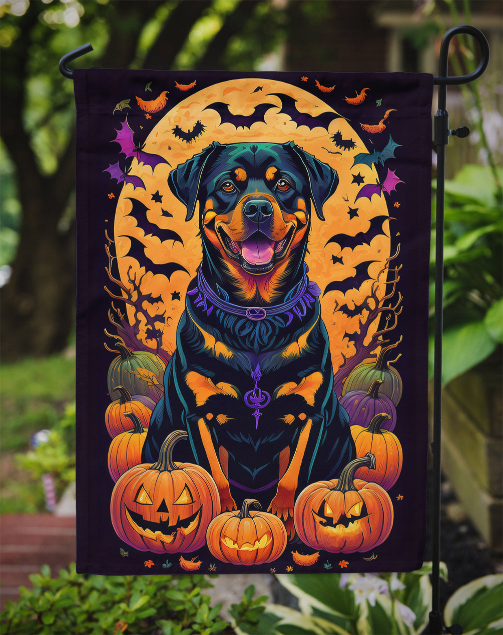 Decorate your space with our Halloween Rottweiler artwork on a Garden Flag. Enhance the beauty of your garden, patio, or yard with Caroline's Treasures Decorative Garden Flag, proudly made in the USA. Crafted from two pieces of thick, double-sided polyester fabric, this 2-ply garden flag is designed to withstand various weather conditions, making it water-resistant and weatherproof. Featuring correctly readable words on both sides, this garden flag offers a delightful visual experience from any angle. With its heavier weight, it stands out among other garden flags, ensuring stability and durability even in wind, rain, and snow. Measuring approximately 11 1/4 inches by 15 1/2 inches, this flag allows you to personalize your outdoor decor. It comes with a 1 1/2-inch sleeve sewn in, allowing easy attachment to any standard garden flag stand or garden size porch hanger (sold separately). Make a statement in your outdoor space with Caroline's Treasures Decorative Garden Flag, a vibrant and high-quality flag that adds color and personality to your surroundings. Proudly made in the USA, it's a symbol of quality craftsmanship and attention to detail.