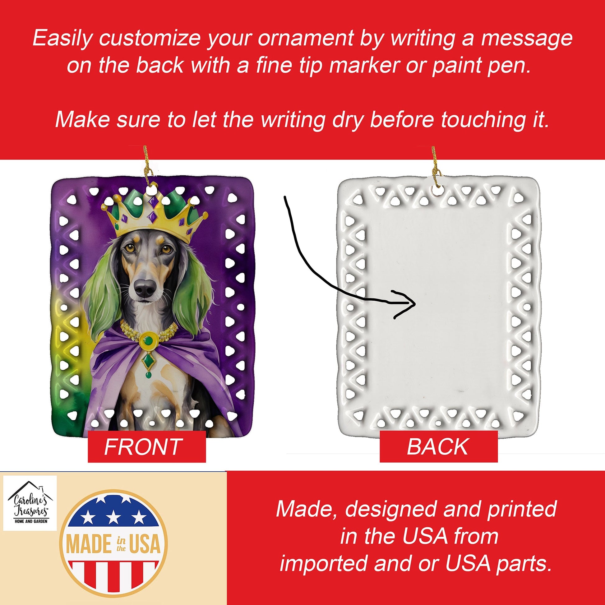 Porcelain Ornament featuring breed specific Saluki artwork. Celebrate Mardi Gras with this Mardi Gras Ornament. Add a unique, personal touch to your holiday decor with our Rectangular Lattice Porcelain Ornament. Perfect for creating cherished memories, this high-quality ornament shines under festive lights, reflecting warmth and joy throughout your Christmas tree. Crafted with a glossy finish, it showcases vibrant, full-color artwork contributed by our talented artists, ensuring your tree is adorned with a burst of color and holiday spirit. What sets this Porcelain Ornament apart is its customizable white back. Use a paint pen or permanent marker to write a heartfelt message, commemorate a special year, or mark an unforgettable date, turning this ornament into a keepsake that will be treasured for years to come. For best results, allow any personalization to dry thoroughly before handling. Each ornament comes complete with a delicate gold cord, making it easy to hang and display. Proudly made in the USA, this ornament measures 3.375 x 2.625 inches and is a thoughtful gift for pet sitters, teachers, family members, or anyone who would appreciate a little extra holiday magic. Bring style, charm, and a touch of personal meaning to your Christmas tree with this beautifully designed ornament..