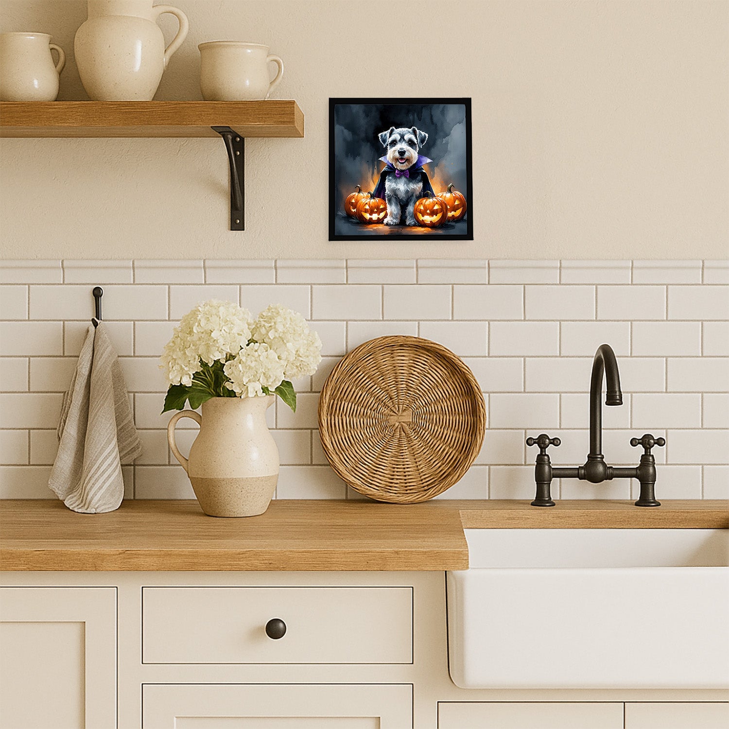 Framed Metal Print featuring breed specific Schnauzer artwork. Celebrate Halloween with this Halloween Framed Metal Print. Looking for wall art that’s stylish, safe, and made to last? Our 8x8 Framed Metal Prints are designed with modern living in mind. Each piece features original artwork printed on durable aluminum, set in a sleek frame that measures 3/4 inch deep for a clean, contemporary finish. Unlike glass prints, these are lightweight, shatter-free, and family-safe. Perfect for kitchens, bathrooms, or covered porches where traditional décor might not hold up. The built-in sawtooth hanger molded into the back makes it easy to hang right out of the box—just use your own nails or screws. Cleaning is simple too: a quick wipe with a damp cloth and mild soap keeps your artwork looking vibrant. Proudly made in Alabama, every print supports our community of artists while adding personality and charm to your home.