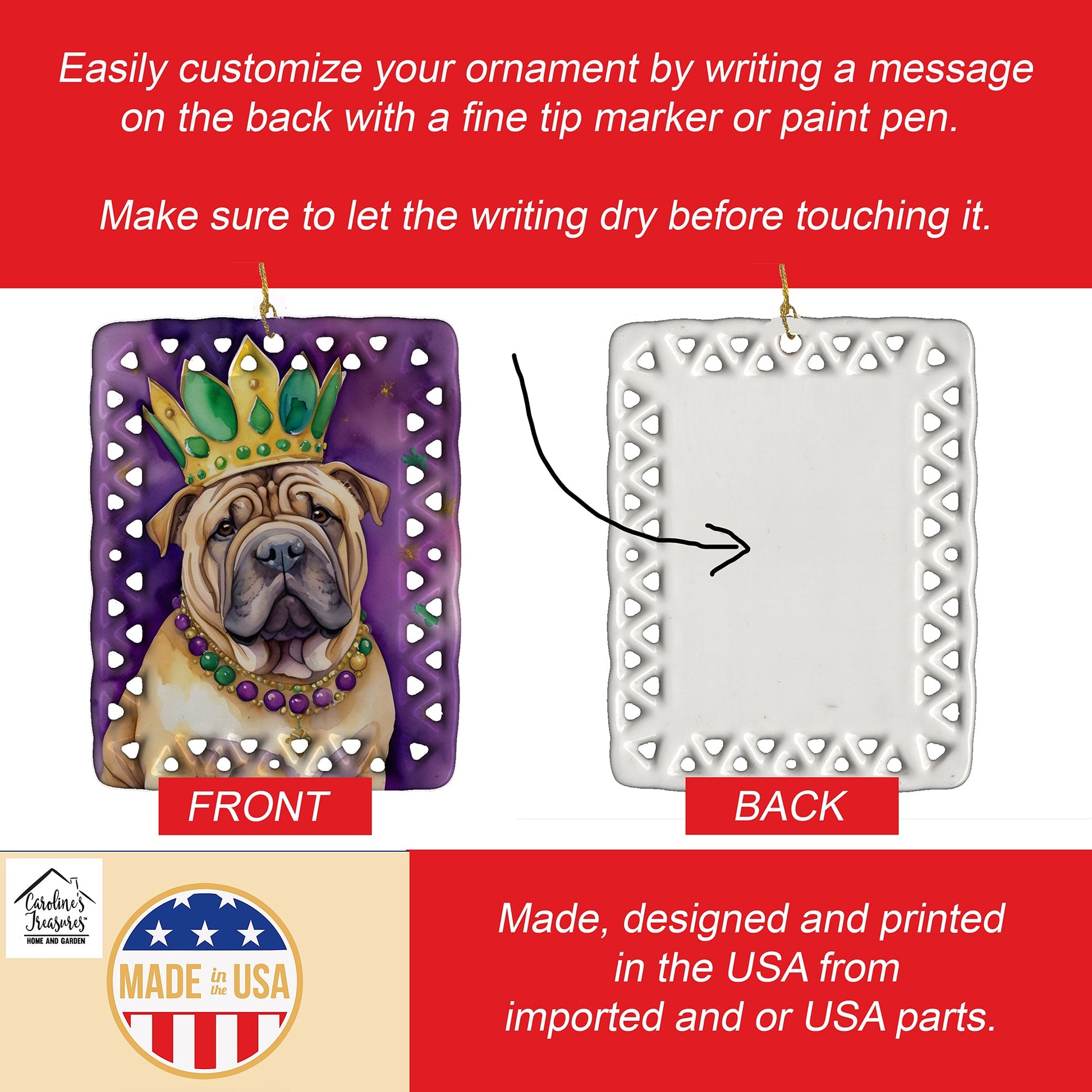 Porcelain Ornament featuring breed specific Shar Pei artwork. Celebrate Mardi Gras with this Mardi Gras Ornament. Add a unique, personal touch to your holiday decor with our Rectangular Lattice Porcelain Ornament. Perfect for creating cherished memories, this high-quality ornament shines under festive lights, reflecting warmth and joy throughout your Christmas tree. Crafted with a glossy finish, it showcases vibrant, full-color artwork contributed by our talented artists, ensuring your tree is adorned with a burst of color and holiday spirit. What sets this Porcelain Ornament apart is its customizable white back. Use a paint pen or permanent marker to write a heartfelt message, commemorate a special year, or mark an unforgettable date, turning this ornament into a keepsake that will be treasured for years to come. For best results, allow any personalization to dry thoroughly before handling. Each ornament comes complete with a delicate gold cord, making it easy to hang and display. Proudly made in the USA, this ornament measures 3.375 x 2.625 inches and is a thoughtful gift for pet sitters, teachers, family members, or anyone who would appreciate a little extra holiday magic. Bring style, charm, and a touch of personal meaning to your Christmas tree with this beautifully designed ornament..