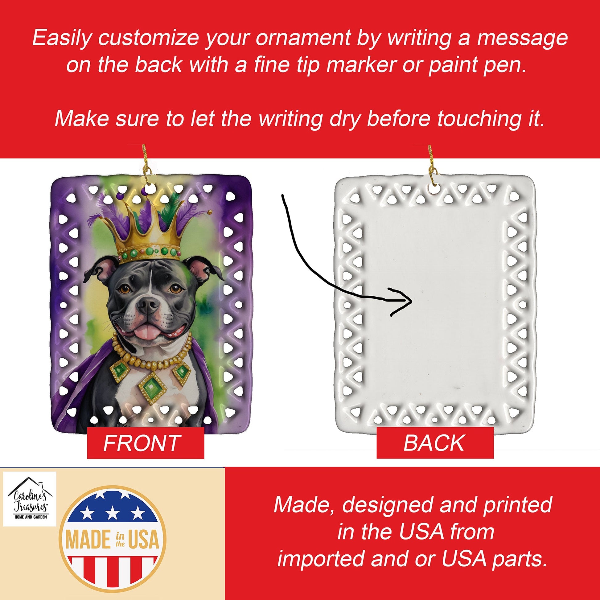 Porcelain Ornament featuring breed specific Staffordshire Bull Terrier artwork. Celebrate Mardi Gras with this Mardi Gras Ornament. Add a unique, personal touch to your holiday decor with our Rectangular Lattice Porcelain Ornament. Perfect for creating cherished memories, this high-quality ornament shines under festive lights, reflecting warmth and joy throughout your Christmas tree. Crafted with a glossy finish, it showcases vibrant, full-color artwork contributed by our talented artists, ensuring your tree is adorned with a burst of color and holiday spirit. What sets this Porcelain Ornament apart is its customizable white back. Use a paint pen or permanent marker to write a heartfelt message, commemorate a special year, or mark an unforgettable date, turning this ornament into a keepsake that will be treasured for years to come. For best results, allow any personalization to dry thoroughly before handling. Each ornament comes complete with a delicate gold cord, making it easy to hang and display. Proudly made in the USA, this ornament measures 3.375 x 2.625 inches and is a thoughtful gift for pet sitters, teachers, family members, or anyone who would appreciate a little extra holiday magic. Bring style, charm, and a touch of personal meaning to your Christmas tree with this beautifully designed ornament..