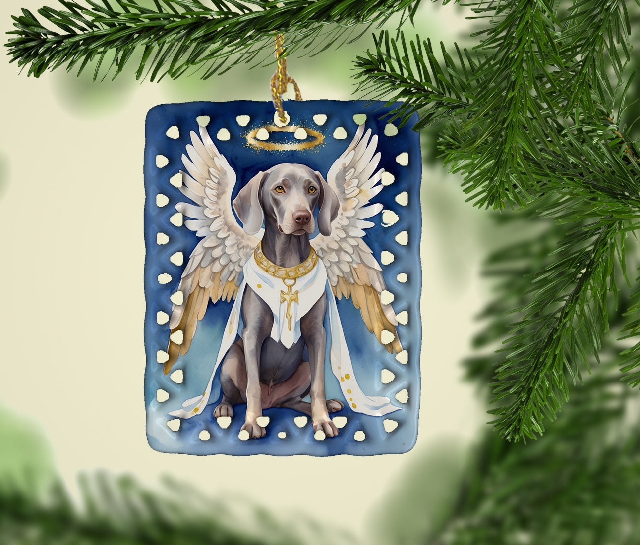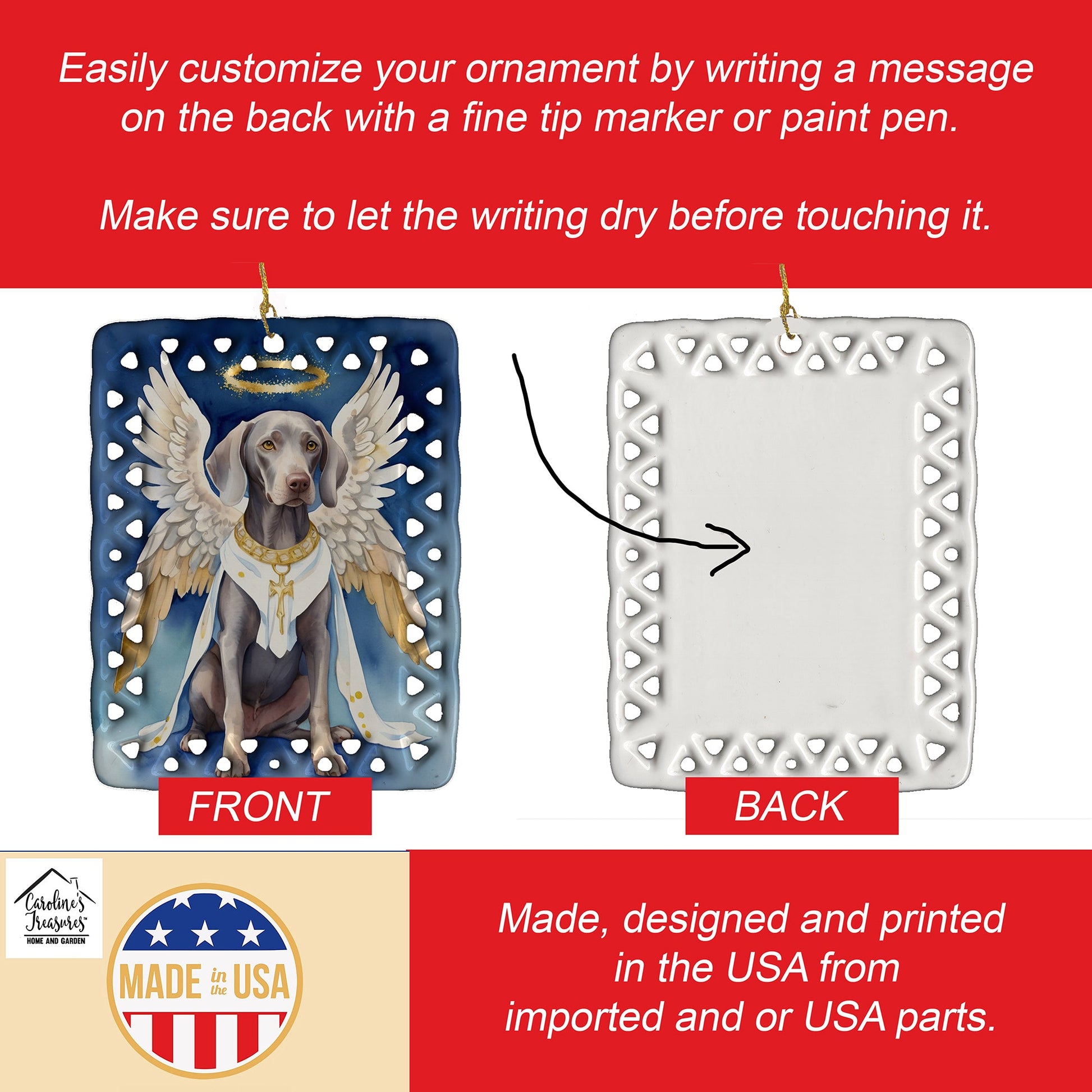 Porcelain Ornament featuring breed specific Weimaraner artwork. Celebrate Christmas with this Christmas Ornament. Add a unique, personal touch to your holiday decor with our Rectangular Lattice Porcelain Ornament. Perfect for creating cherished memories, this high-quality ornament shines under festive lights, reflecting warmth and joy throughout your Christmas tree. Crafted with a glossy finish, it showcases vibrant, full-color artwork contributed by our talented artists, ensuring your tree is adorned with a burst of color and holiday spirit. What sets this Porcelain Ornament apart is its customizable white back. Use a paint pen or permanent marker to write a heartfelt message, commemorate a special year, or mark an unforgettable date, turning this ornament into a keepsake that will be treasured for years to come. For best results, allow any personalization to dry thoroughly before handling. Each ornament comes complete with a delicate gold cord, making it easy to hang and display. Proudly made in the USA, this ornament measures 3.375 x 2.625 inches and is a thoughtful gift for pet sitters, teachers, family members, or anyone who would appreciate a little extra holiday magic. Bring style, charm, and a touch of personal meaning to your Christmas tree with this beautifully designed ornament..