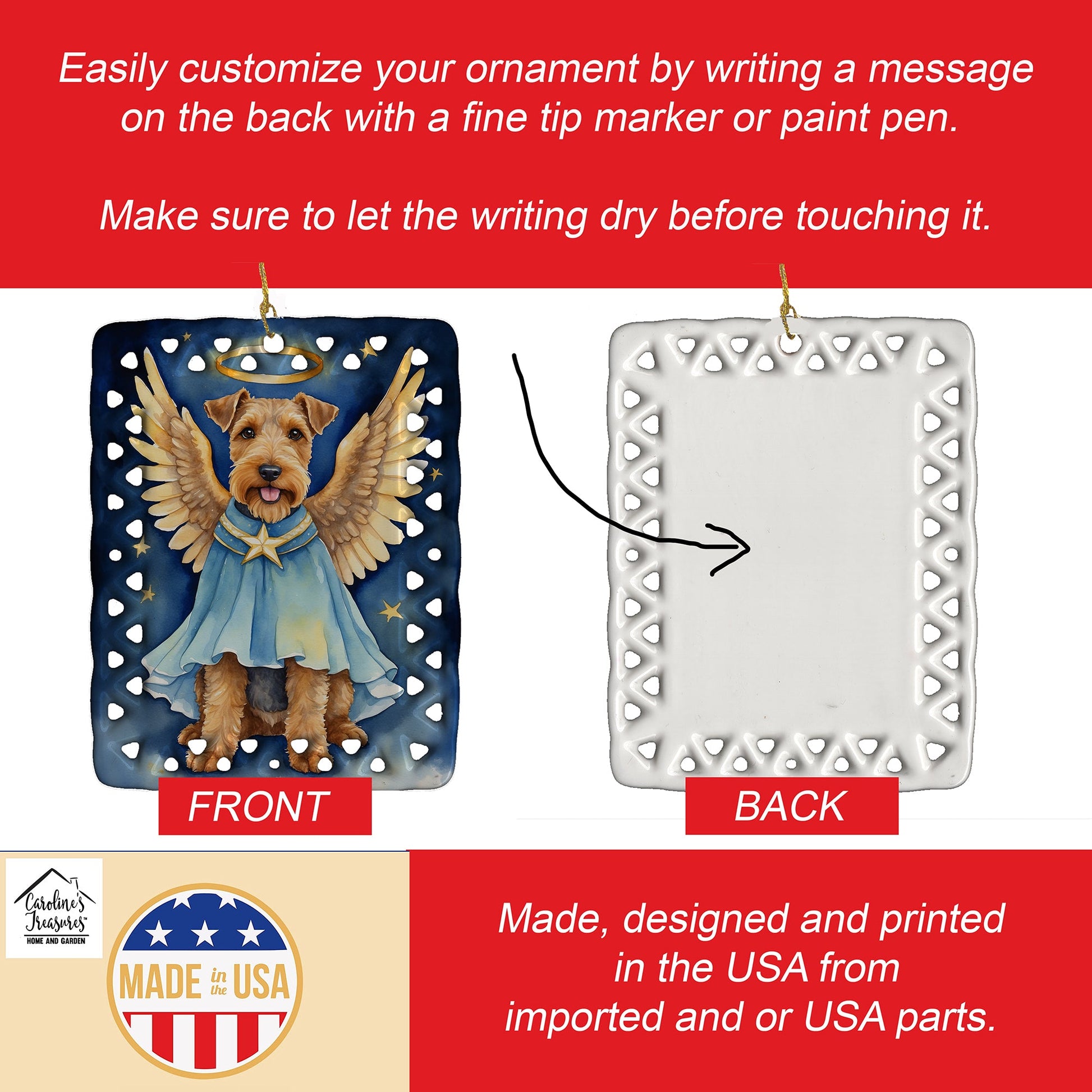 Porcelain Ornament featuring breed specific Welsh Terrier artwork. Celebrate Christmas with this Christmas Ornament. Add a unique, personal touch to your holiday decor with our Rectangular Lattice Porcelain Ornament. Perfect for creating cherished memories, this high-quality ornament shines under festive lights, reflecting warmth and joy throughout your Christmas tree. Crafted with a glossy finish, it showcases vibrant, full-color artwork contributed by our talented artists, ensuring your tree is adorned with a burst of color and holiday spirit. What sets this Porcelain Ornament apart is its customizable white back. Use a paint pen or permanent marker to write a heartfelt message, commemorate a special year, or mark an unforgettable date, turning this ornament into a keepsake that will be treasured for years to come. For best results, allow any personalization to dry thoroughly before handling. Each ornament comes complete with a delicate gold cord, making it easy to hang and display. Proudly made in the USA, this ornament measures 3.375 x 2.625 inches and is a thoughtful gift for pet sitters, teachers, family members, or anyone who would appreciate a little extra holiday magic. Bring style, charm, and a touch of personal meaning to your Christmas tree with this beautifully designed ornament..