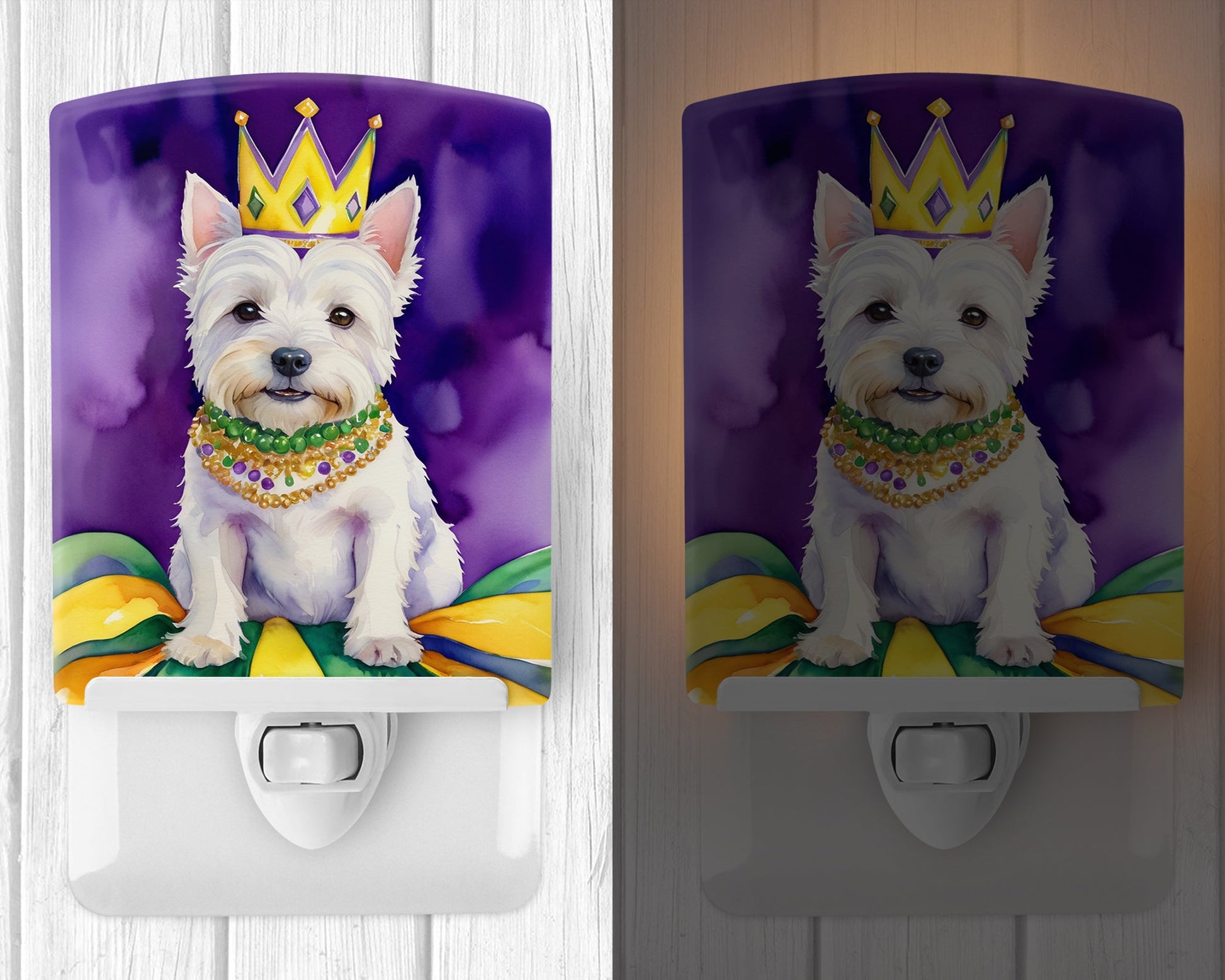 Decorate your space with our Mardi Gras West Highland White Terrier artwork on a Night Light. Introduce a splash of artistic flair and subtle illumination to your space with the Decorative Ceramic Night Light from Caroline's Treasures. Perfect for any room, this night light seamlessly blends functionality with an aesthetic appeal, offering a stylish solution to brighten up dark corners of your home or office. Boasting a six-inch high by four-inch wide ceramic tile at the front, it showcases vivid, full-color artwork from distinguished artists, transforming a simple utility into a vibrant art piece. The artwork is securely encased in a robust metal holder, ensuring durability and longevity. Two screws are provided to firmly affix the tile into the holder. The holder extends three inches deep, housing an included bulb that emits a soft, welcoming glow. This product meets all safety standards, as evidenced by its UL approval. Proudly made in the United States from imported components, this Decorative Ceramic Night Light is not just a functional device; it's a statement piece that enhances the ambiance of your surroundings.