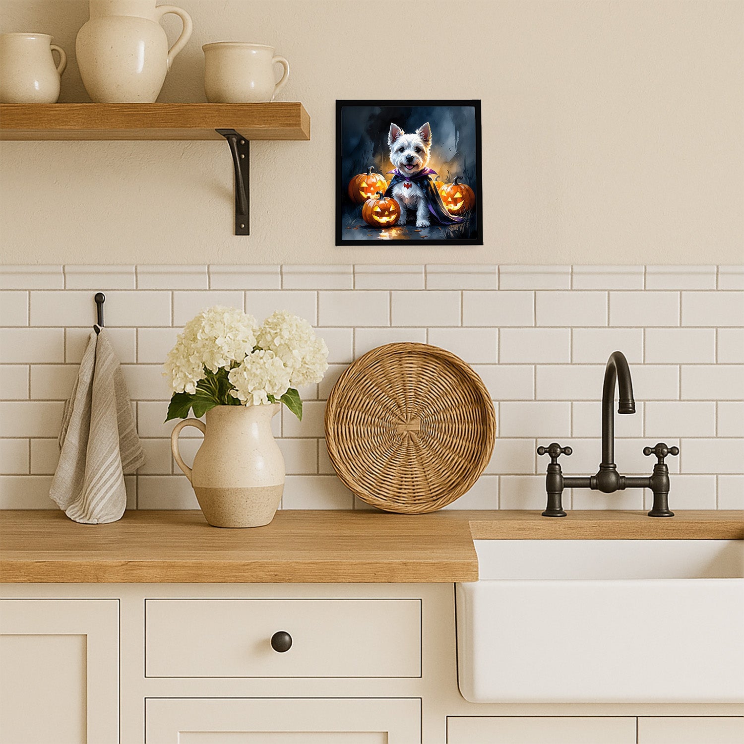 Framed Metal Print featuring breed specific West Highland White Terrier artwork. Celebrate Halloween with this Halloween Framed Metal Print. Looking for wall art that’s stylish, safe, and made to last? Our 8x8 Framed Metal Prints are designed with modern living in mind. Each piece features original artwork printed on durable aluminum, set in a sleek frame that measures 3/4 inch deep for a clean, contemporary finish. Unlike glass prints, these are lightweight, shatter-free, and family-safe. Perfect for kitchens, bathrooms, or covered porches where traditional décor might not hold up. The built-in sawtooth hanger molded into the back makes it easy to hang right out of the box—just use your own nails or screws. Cleaning is simple too: a quick wipe with a damp cloth and mild soap keeps your artwork looking vibrant. Proudly made in Alabama, every print supports our community of artists while adding personality and charm to your home.