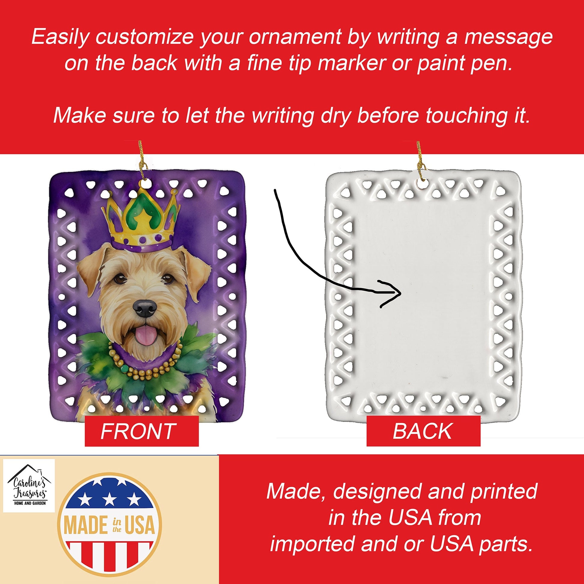 Porcelain Ornament featuring breed specific Wheaten Terrier artwork. Celebrate Mardi Gras with this Mardi Gras Ornament. Add a unique, personal touch to your holiday decor with our Rectangular Lattice Porcelain Ornament. Perfect for creating cherished memories, this high-quality ornament shines under festive lights, reflecting warmth and joy throughout your Christmas tree. Crafted with a glossy finish, it showcases vibrant, full-color artwork contributed by our talented artists, ensuring your tree is adorned with a burst of color and holiday spirit. What sets this Porcelain Ornament apart is its customizable white back. Use a paint pen or permanent marker to write a heartfelt message, commemorate a special year, or mark an unforgettable date, turning this ornament into a keepsake that will be treasured for years to come. For best results, allow any personalization to dry thoroughly before handling. Each ornament comes complete with a delicate gold cord, making it easy to hang and display. Proudly made in the USA, this ornament measures 3.375 x 2.625 inches and is a thoughtful gift for pet sitters, teachers, family members, or anyone who would appreciate a little extra holiday magic. Bring style, charm, and a touch of personal meaning to your Christmas tree with this beautifully designed ornament..