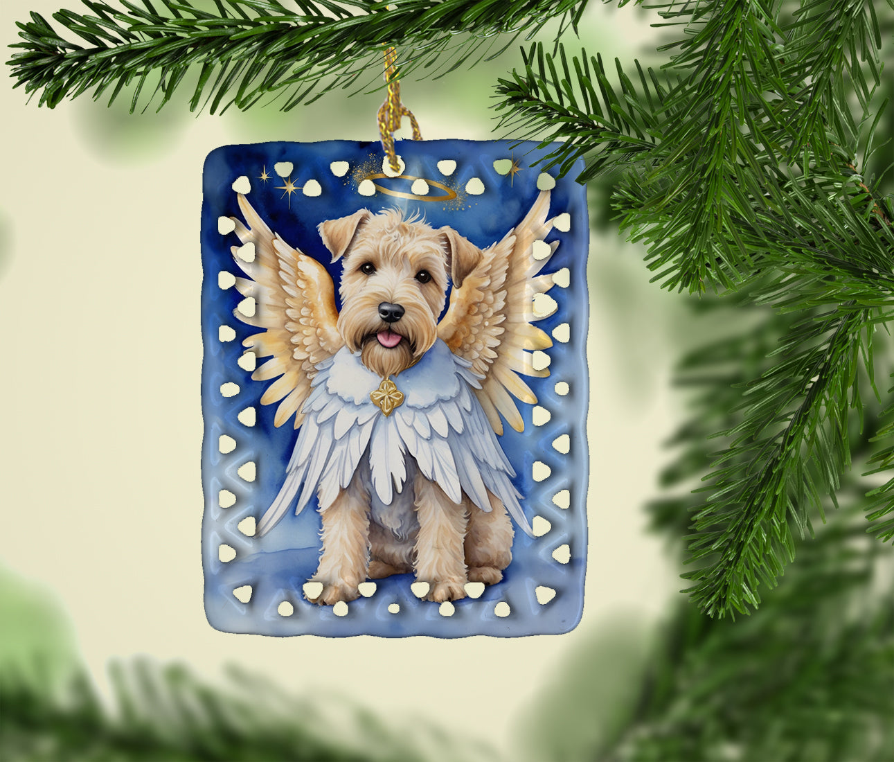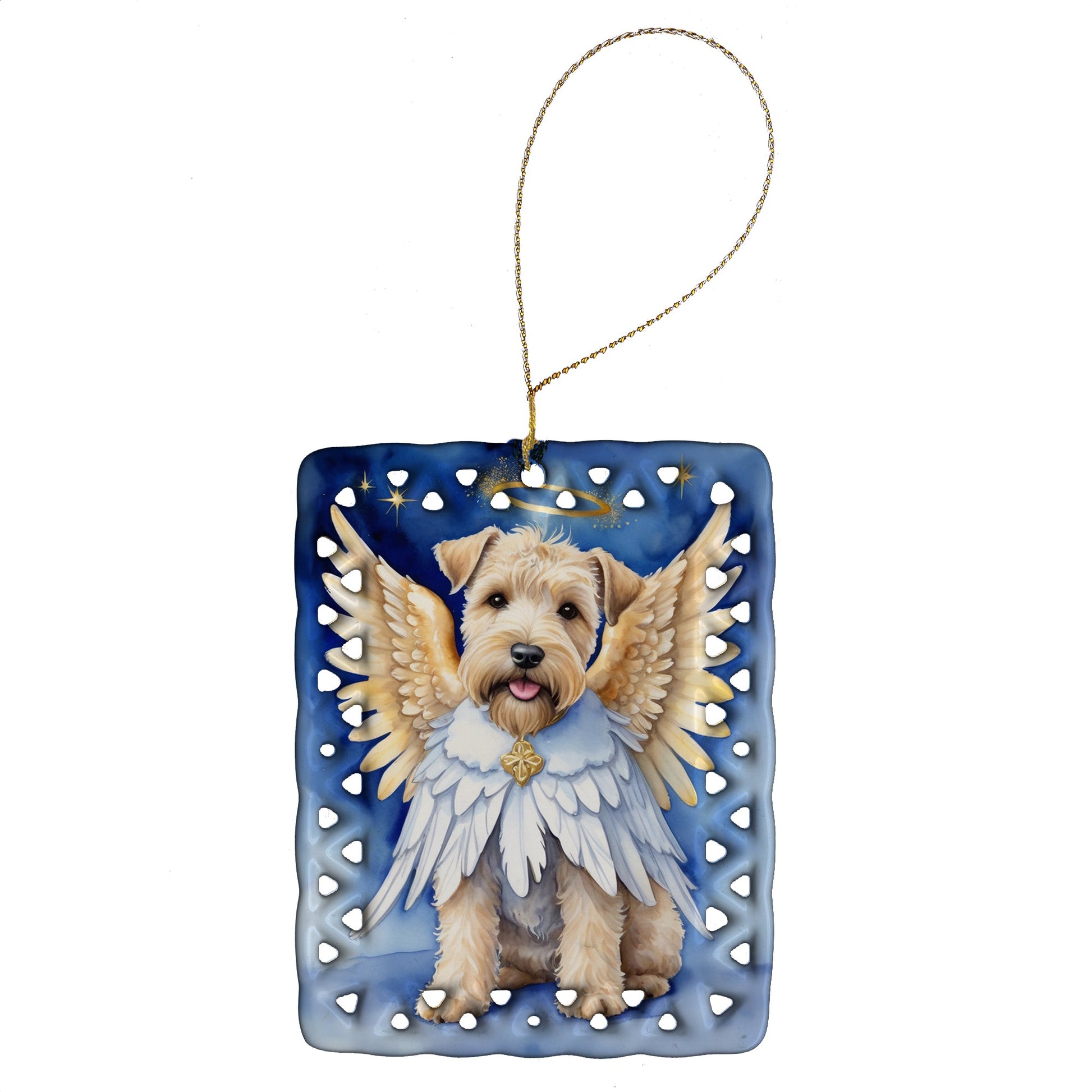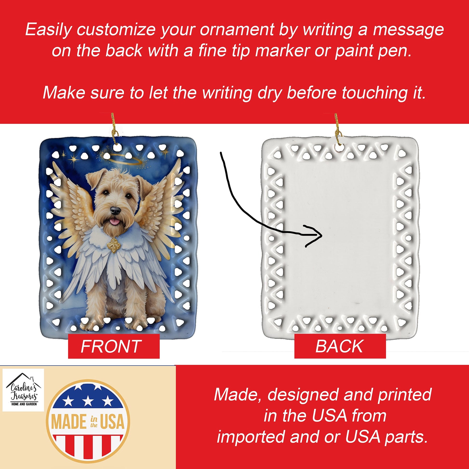 Porcelain Ornament featuring breed specific Wheaten Terrier artwork. Celebrate Christmas with this Christmas Ornament. Add a unique, personal touch to your holiday decor with our Rectangular Lattice Porcelain Ornament. Perfect for creating cherished memories, this high-quality ornament shines under festive lights, reflecting warmth and joy throughout your Christmas tree. Crafted with a glossy finish, it showcases vibrant, full-color artwork contributed by our talented artists, ensuring your tree is adorned with a burst of color and holiday spirit. What sets this Porcelain Ornament apart is its customizable white back. Use a paint pen or permanent marker to write a heartfelt message, commemorate a special year, or mark an unforgettable date, turning this ornament into a keepsake that will be treasured for years to come. For best results, allow any personalization to dry thoroughly before handling. Each ornament comes complete with a delicate gold cord, making it easy to hang and display. Proudly made in the USA, this ornament measures 3.375 x 2.625 inches and is a thoughtful gift for pet sitters, teachers, family members, or anyone who would appreciate a little extra holiday magic. Bring style, charm, and a touch of personal meaning to your Christmas tree with this beautifully designed ornament..