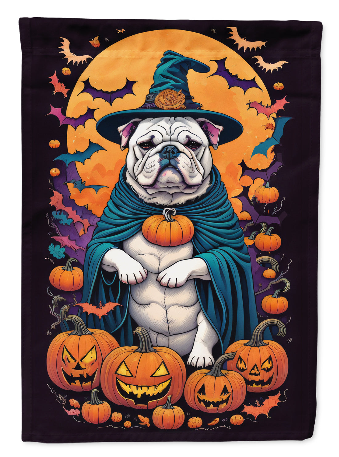 White English Bulldog Witchy Halloween Garden Flag – Witch Dog with Pumpkins, Bats & Jack-o'-Lanterns