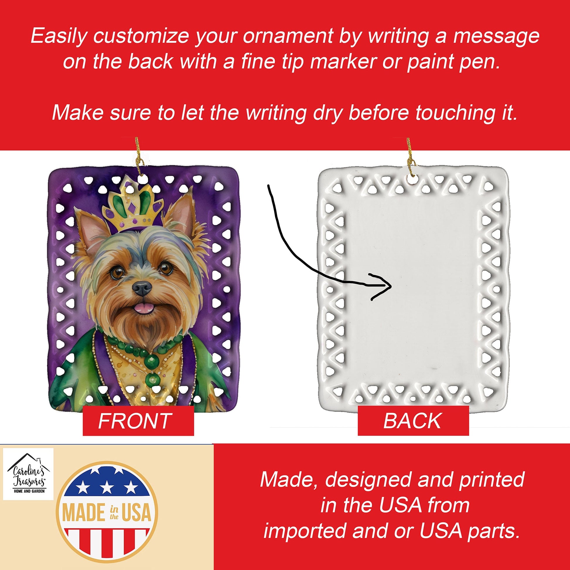 Porcelain Ornament featuring breed specific Yorkshire Terrier Yorkie artwork. Celebrate Mardi Gras with this Mardi Gras Ornament. Add a unique, personal touch to your holiday decor with our Rectangular Lattice Porcelain Ornament. Perfect for creating cherished memories, this high-quality ornament shines under festive lights, reflecting warmth and joy throughout your Christmas tree. Crafted with a glossy finish, it showcases vibrant, full-color artwork contributed by our talented artists, ensuring your tree is adorned with a burst of color and holiday spirit. What sets this Porcelain Ornament apart is its customizable white back. Use a paint pen or permanent marker to write a heartfelt message, commemorate a special year, or mark an unforgettable date, turning this ornament into a keepsake that will be treasured for years to come. For best results, allow any personalization to dry thoroughly before handling. Each ornament comes complete with a delicate gold cord, making it easy to hang and display. Proudly made in the USA, this ornament measures 3.375 x 2.625 inches and is a thoughtful gift for pet sitters, teachers, family members, or anyone who would appreciate a little extra holiday magic. Bring style, charm, and a touch of personal meaning to your Christmas tree with this beautifully designed ornament..
